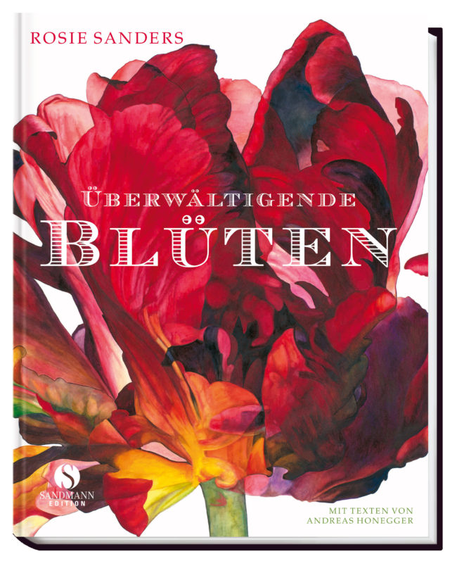 Am Anfang steht für die Malerin die Betrachtung, das genaue Beobachten von allen Seiten, bevor sie in großem Maßstab zu malen beginnt. „Sobald ich diesen Anfang gemalt habe, stehe ich vor einem neuen Problem“, erklärt Rosie Sanders, „Was als Nächstes malen? Das ganze Bild ist also gewissermaßen ein Zusammenspiel von Schritten der Problemlösung und der Kunst zu wissen, wann man aufhören muss und welche Teile man auslässt.“ Dieser Prozess verändere die Blumen unmerklich, aber eindeutig, beschreibt Andreas Honegger in seinem Beitrag: „Sie gewinnen an Dreidimensionalität, sie werden zu Pflanzenarchitektur.“ Rosie Sanders bevorzugt Aquarellfarben, unterstreicht und pointiert mit ihnen das Spiel des Lichts. Sie schaut und übersetzt ins große Format, gibt Fülle, setzt Akzente und Lichter. „Ihre Augen holen für uns die stille Dramatik hervor, die in den Blüten liegt, in ihrem Werden und Vergehen“, so Honegger. „Es ist dieser kleine Hauch von Mehr, den die Fotografie nicht erreichen kann, der ihre Blumenbilder so überwältigend werden lässt.“