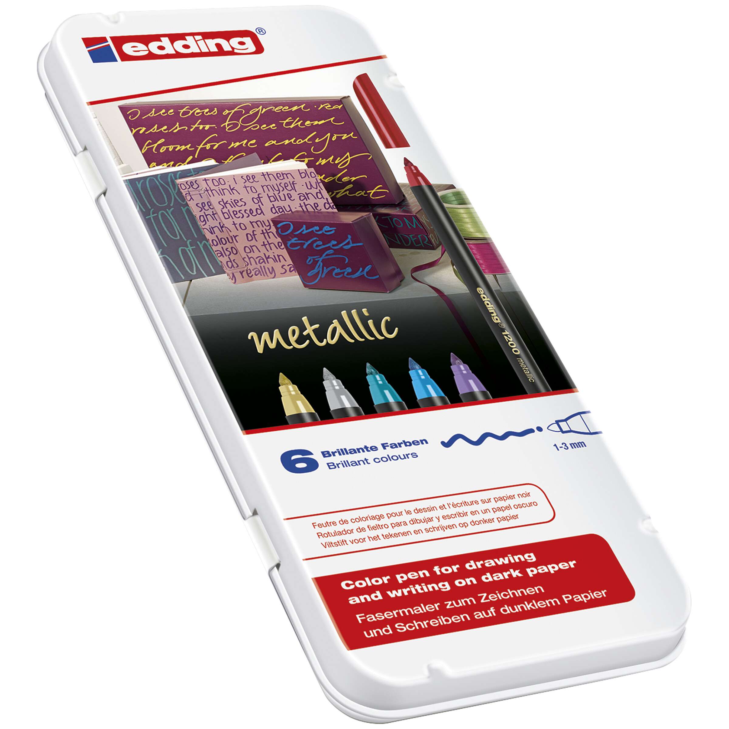 Der klassische Edding 1200 dient Künstlern und Grafikern als ideales Handwerkzeug, von der Skizze bis zum finalen Layout. Mit den Metallic-Fasermalern lassen sich auf hellen, dunklen und sogar glatt beschichteten Papiersorten interessante Gestaltungsakzente setzen. Die wasserbasierte Pigmenttinte wird durch ein Filtersystem in die breite, weich gleitende Rundspitze geleitet. Nach dem Auftrag zeichnet sich die Farbe durch hohe Lichtbeständigkeit aus. Die Fasermaler in der Strichstärke 1–3 mm gibt es in 6 Farbtönen.