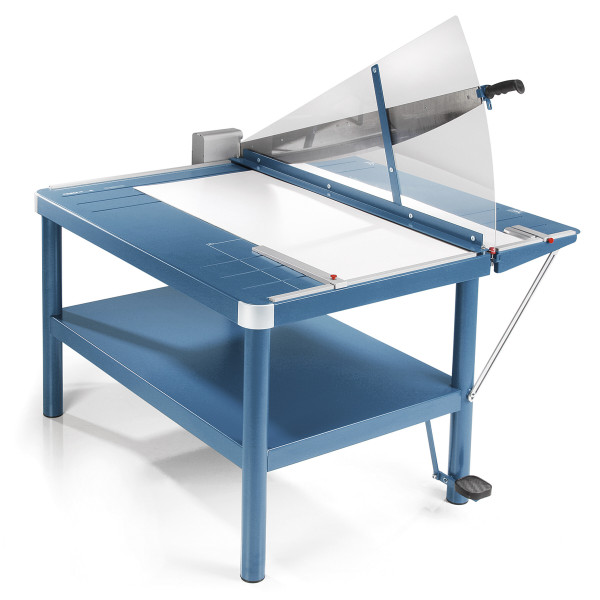 Hebel-Schneidemaschine mit fest verbundenem Untergestell (Höhe 74 cm) inkl. Ablageboden. Die Fußpressung erleichtert das schnelle und problemlose Einrichten und exakte Bearbeiten von großformatigen Vorlagen oder Reinzeichen- und...