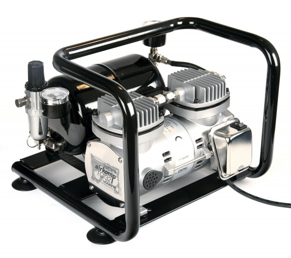 Für den professionellen Airbrush-Einsatz: mit Doppelzylinder-Motor, vollautomatischer Ein-/Abschaltung durch Kesseldruckwächter, Tank-Überdruckventil, Luft- und Kondensatablassventil, Kesseldruckanzeiger, Wasserabscheider mit Ausgangsdruckregler und -anzeiger, einem 2-fach Luftverteiler und einem 3-m-Schlauch mit 1/8"-Anschlüssen. Für 2 Pistolen geeignet.