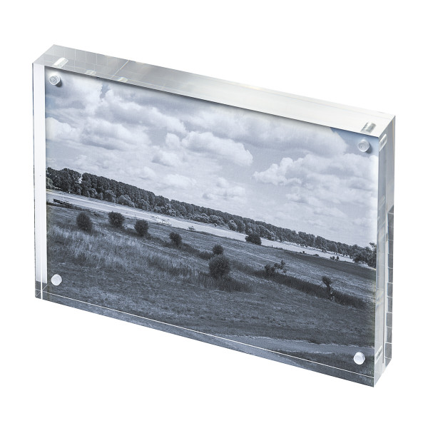 Dekorativer wie praktischer Acryldoppelblock mit integrierten Magneten als Fotorahmen. Das Foto liegt zwischen den beiden transparenten Acrylblöcken, die durch vier kleine Magnete fest zusammengehalten werden. Einlegen und Austauschen von Fotos leicht gemacht.