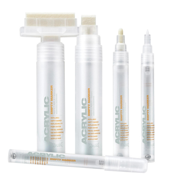 Montana Leermarker sind qualitativ hochwertige Pump-Marker zum Befüllen. Alle Stifte bestehen aus transparentem Kunststoff, so bleibt der Füllstand jederzeit sichtbar. Die Spitze ist austauschbar und neben der mitgelieferten sind auch noch weitere Spitzen/Breiten für diesen Marker erhältlich. Ideal in der Anwendung mit Montana Acrylic Paint. Hinweis: Der Stift lässt sich inks herum aufdrehen. Erhältlich in 5 Strichbreiten.