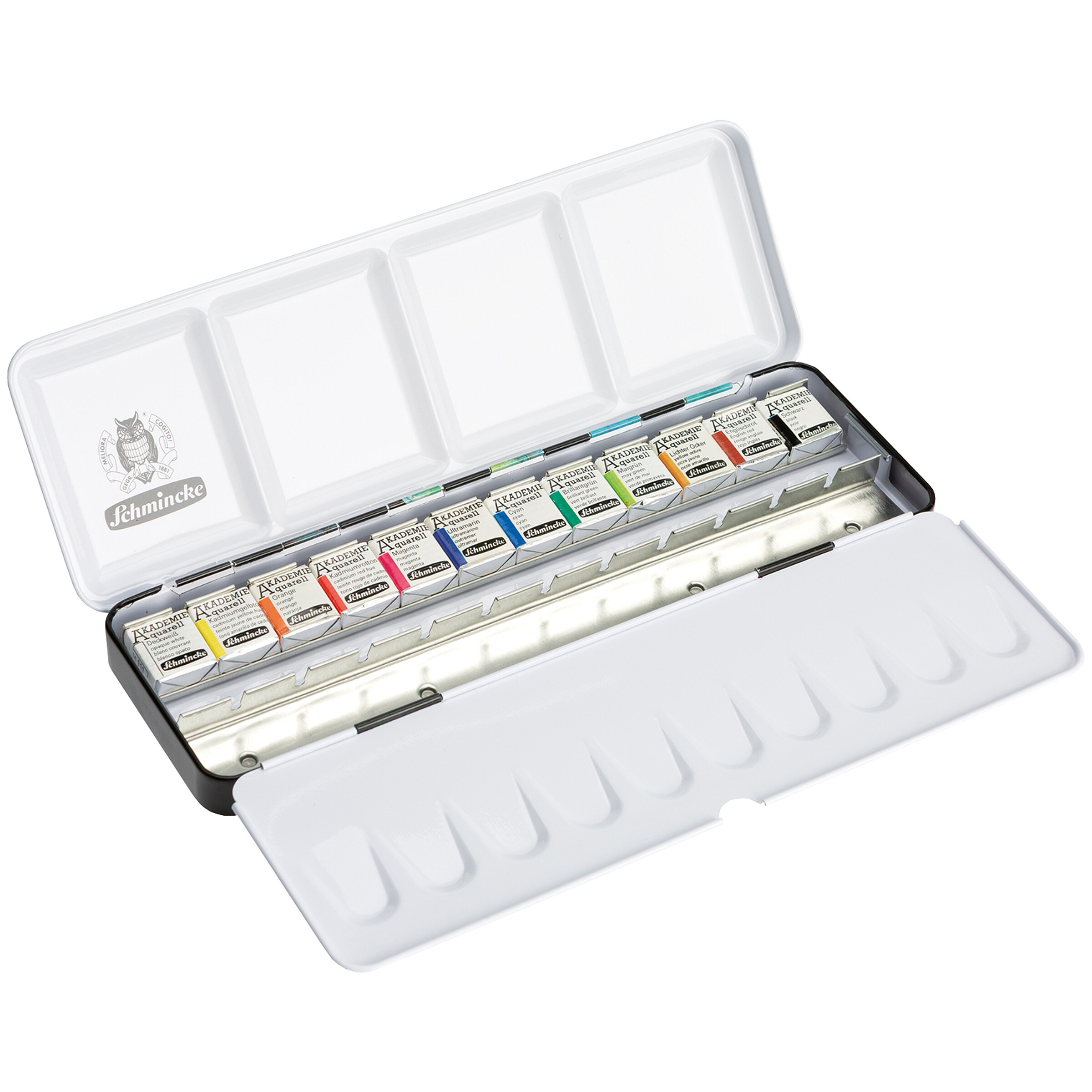 Der Metallkasten enthält 12 halbe (1/2) Näpfchen (N) Akademie Aquarellfarbe mit mehrfach flüssig vergossenen, hoch lichtechten, brillanten Farben (Hellgelb Zitron, Karmin, Brillantgrün, Englischrot, Indischgelb, Ultramarin,...