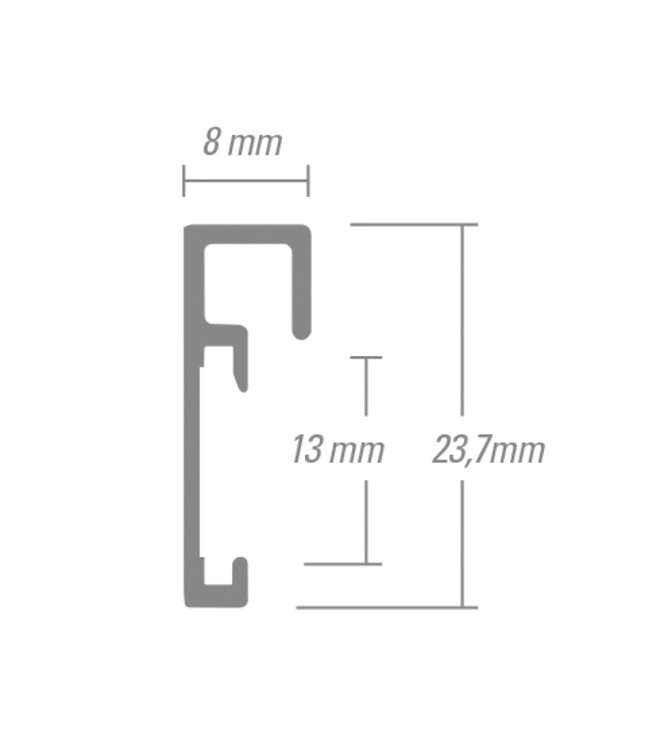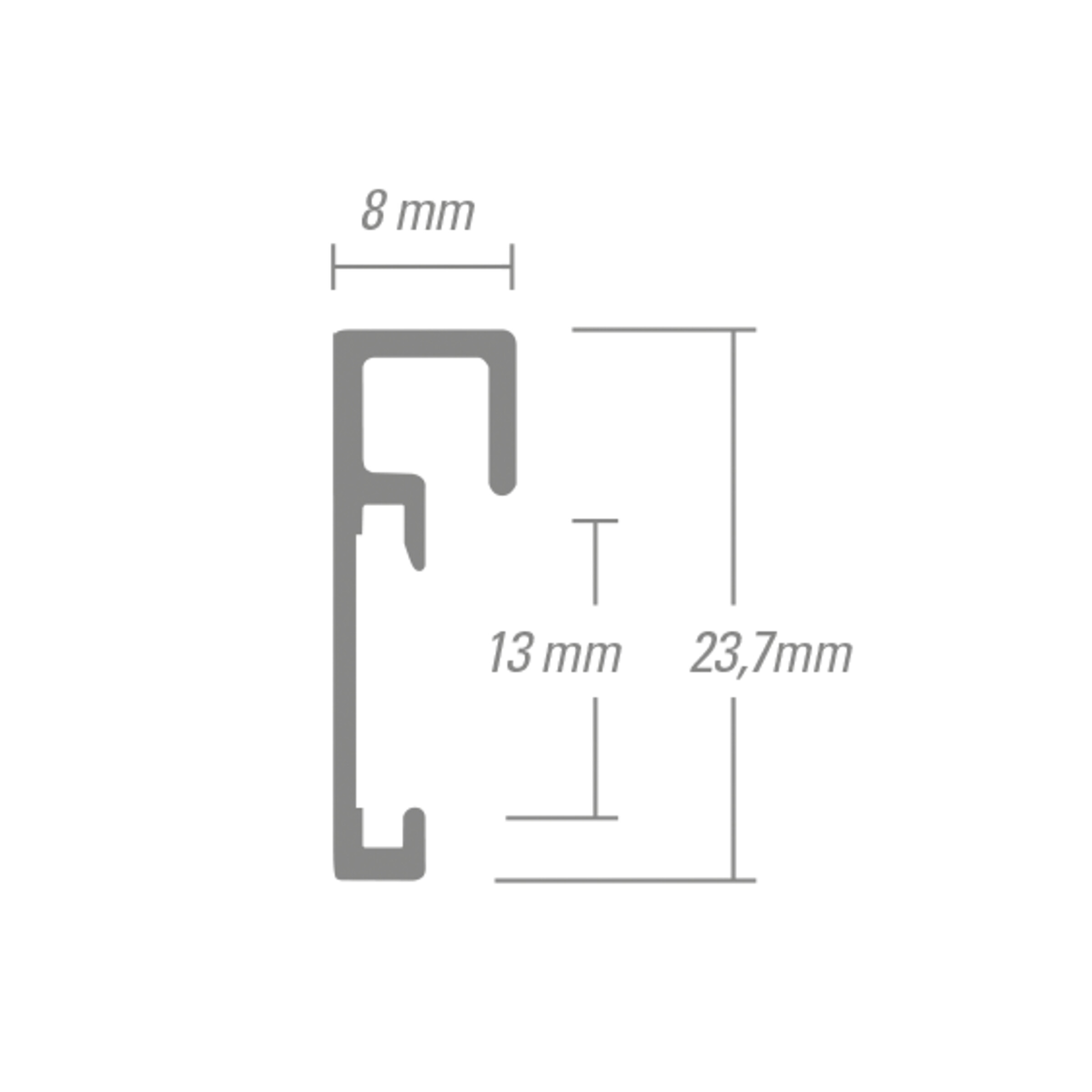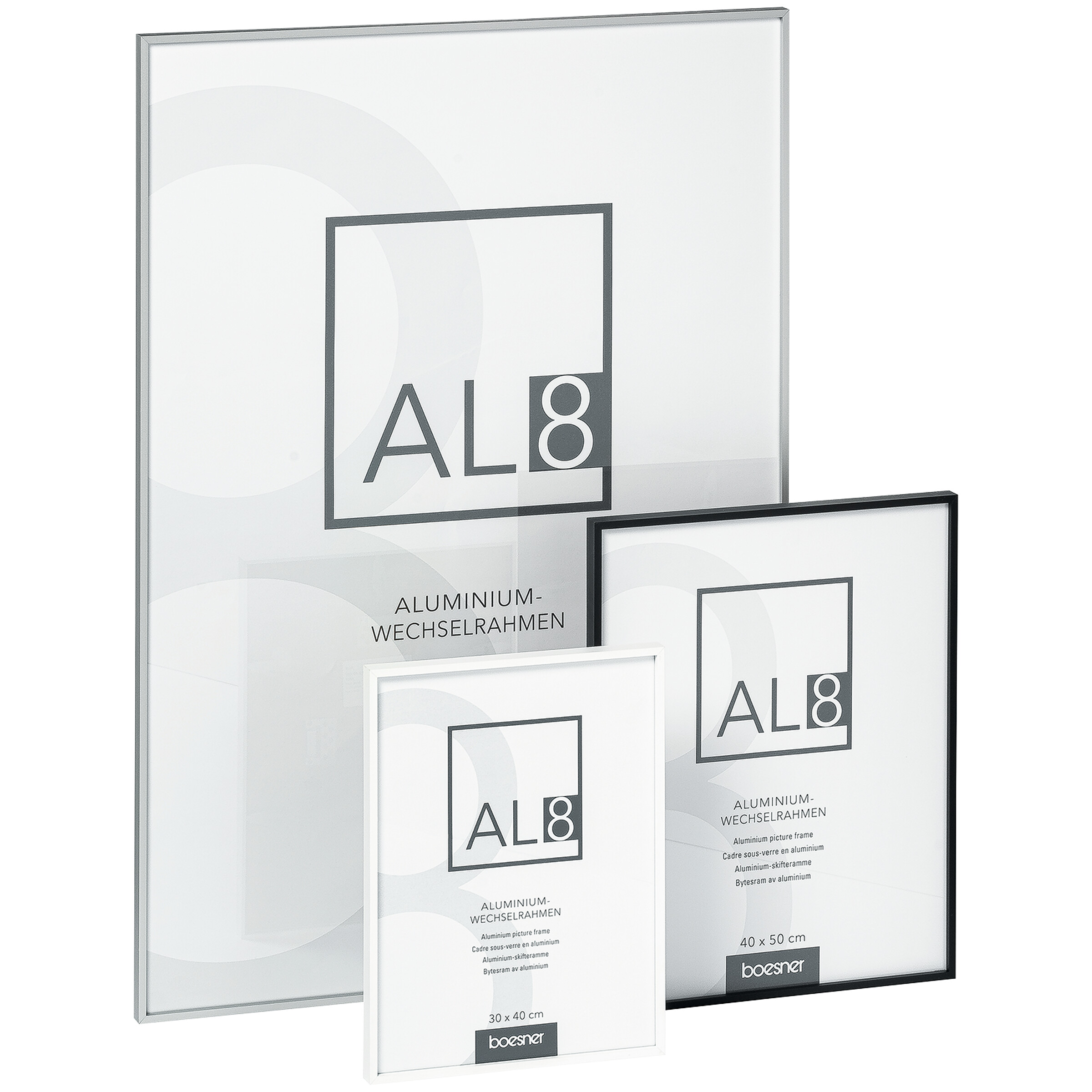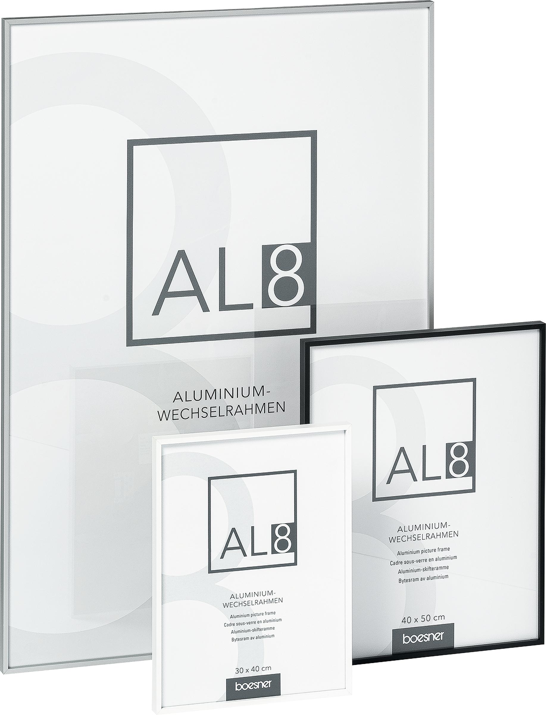 Der Aluminiumrahmen in klarer, geradliniger Formgebung überzeugt durch seine visuell ungewöhnliche Geometrie: Bei einer schmalen Sichtkantenbreite von nur 8 mm verleiht die seitliche Sichtkante von 7 mm dem gerahmten Werk eine besondere...