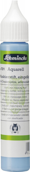 Wieder entfernbare Maskierflüssigkeit, neutral oder blau eingefärbt, im praktischen Dosierstift speziell für Detailarbeiten. Auszusparende Details werden mit dem Maskierstift vorgezeichnet und nach Trocknung mit Aquarellfarbe übermalt. Die Maskierflüssigkeit sollte nicht länger als zwei Tage auf dem Träger bleiben und wird mit dem Finger oder Radiergummi weggerubbelt.