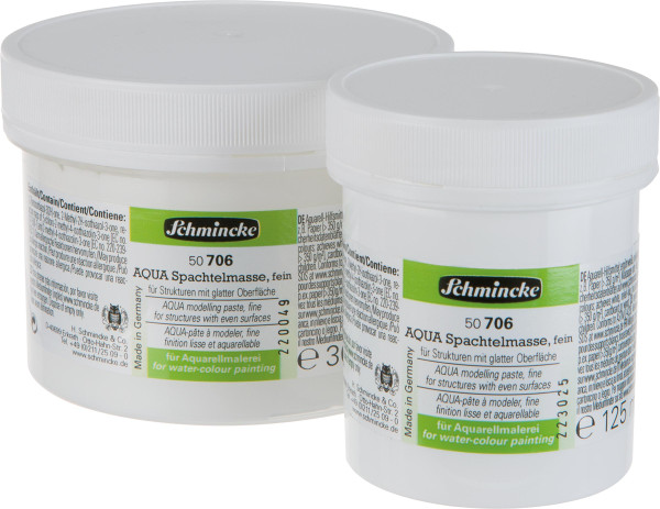 Feine oder grobe Spachtelmasse für plastisches Gestalten von Details und dreidimensionale Struktureffekte. Sie wird mit dem Palettmesser oder Spachtel aufgetragen, strukturiert bzw. modelliert und kann nach Durchtrocknung mit Aquarellfarbe übermalt werden. Aqua Spachtelmasse grob ergibt körnige, die feine Variante hingegen glatte Oberflächen.