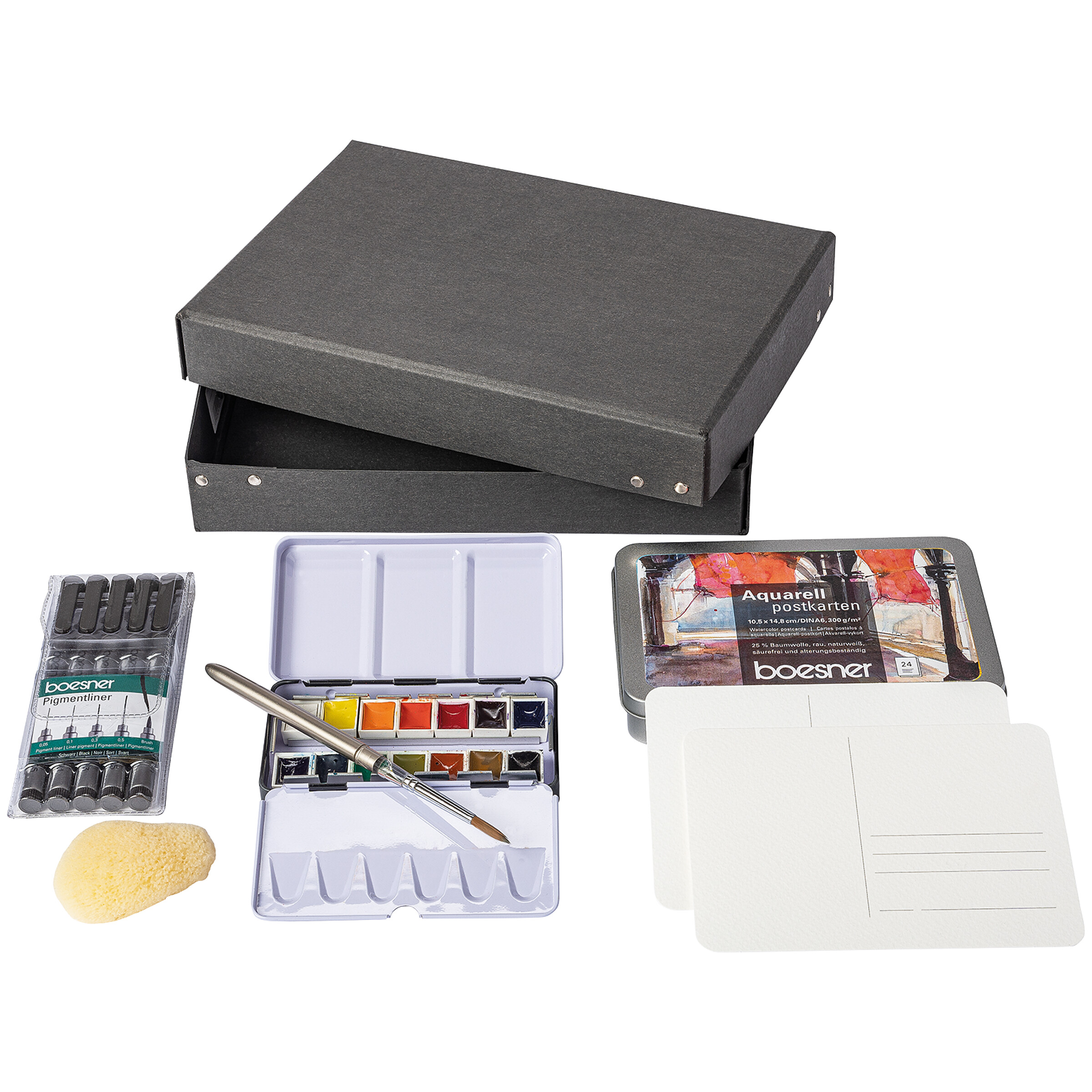 Das sorgfältig zusammengestellte Set enthält alles, was für die Gestaltung individueller Aquarell-Grüße benötigt wird: ein boesner Scene Reisemalkasten mit 14 1/2 Näpfchen inkl. Pinsel, ein 5er-Set boesner Pigmentliner zum Skizzieren und Vorzeichnen, ein feinporiges Ars Nova Naturschwämmchen für interessante Texturen (Ø 5−6,5 cm) und 24 boesner Aquarell-Postkarten aus naturweißem Aquarellpapier mit abgerundeten Ecken und rückseitig aufgedrucktem Adressfeld. Verpackt ist das Set in einer dekorativen Black Box aus stabilem schwarzem Karton. Ideal als Geschenk.