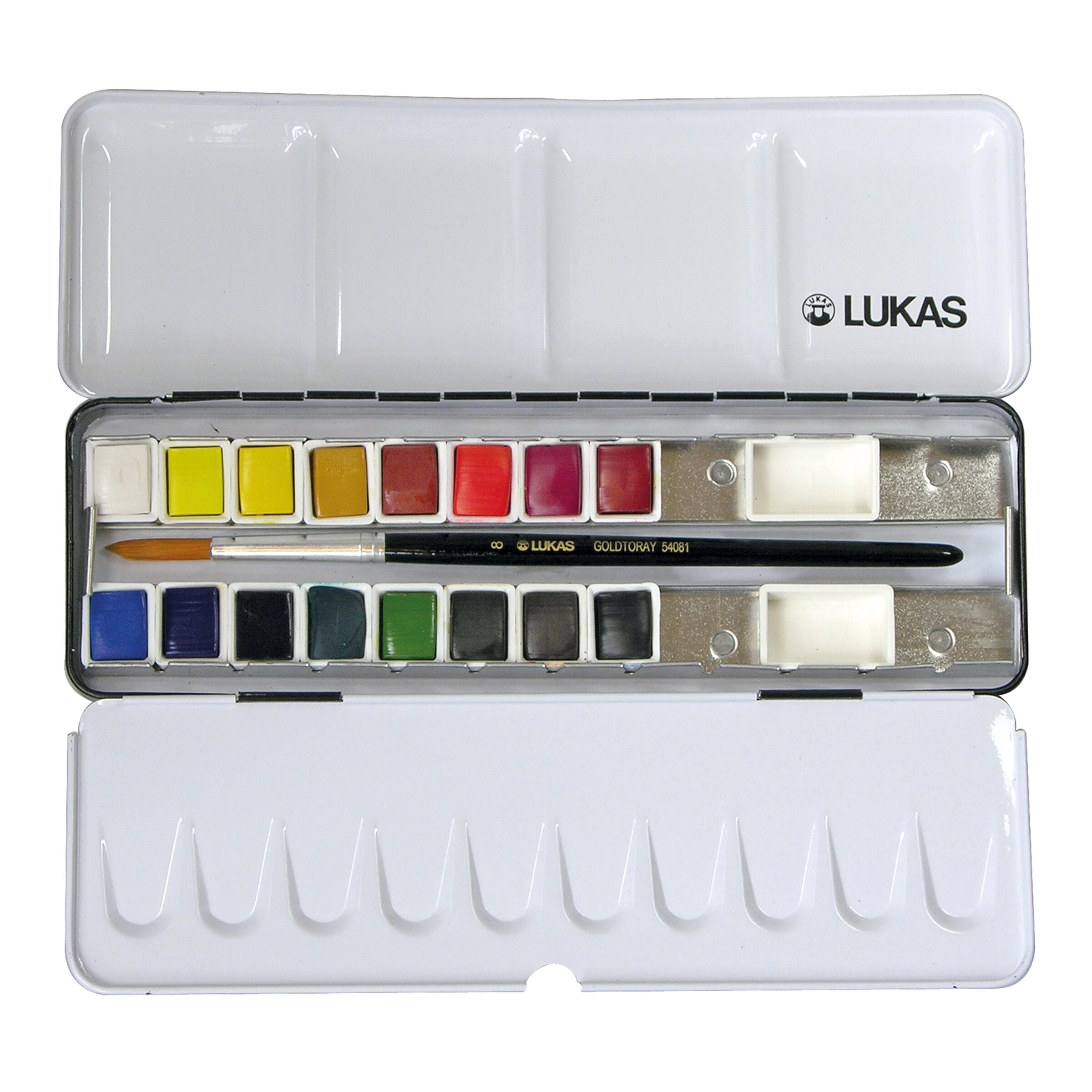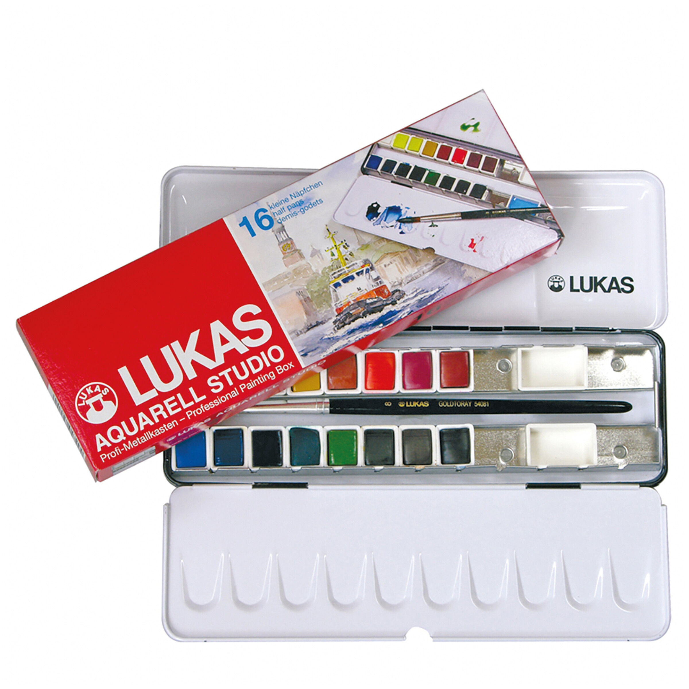 Die feinen, feuchten Künstler-Aquarellfarben von Aquarell Studio enthalten ausschließlich reine, hochwertige Pigmente in hoher Konzentration und weisen daher sehr gute Lichtechtheit, Farbintensität, Brillanz und Transparenz auf. Zudem lassen sie sich leicht anlösen und besitzen eine ausgezeichnete Vermal- und Verwaschbarkeit durch die Bindemittel-Verbindung aus reinem Gummi arabicum, ausgewählten Dextrinen und Glukose-Derivaten. Mithilfe des ausgewogenen Spektrums von 16 Farbtönen können zahlreiche weitere, brillante Farbnuancen und feinste Verwaschungen erzielt werden. Der Metallkasten beinhaltet 16 halbe (1/2) Näpfchen (N), 2 leere Näpfchen zur Wasseraufnahme, 2 ausklappbare Mischpaletten und einen Aquarellpinsel. Kastengröße: 7 x 22 cm.