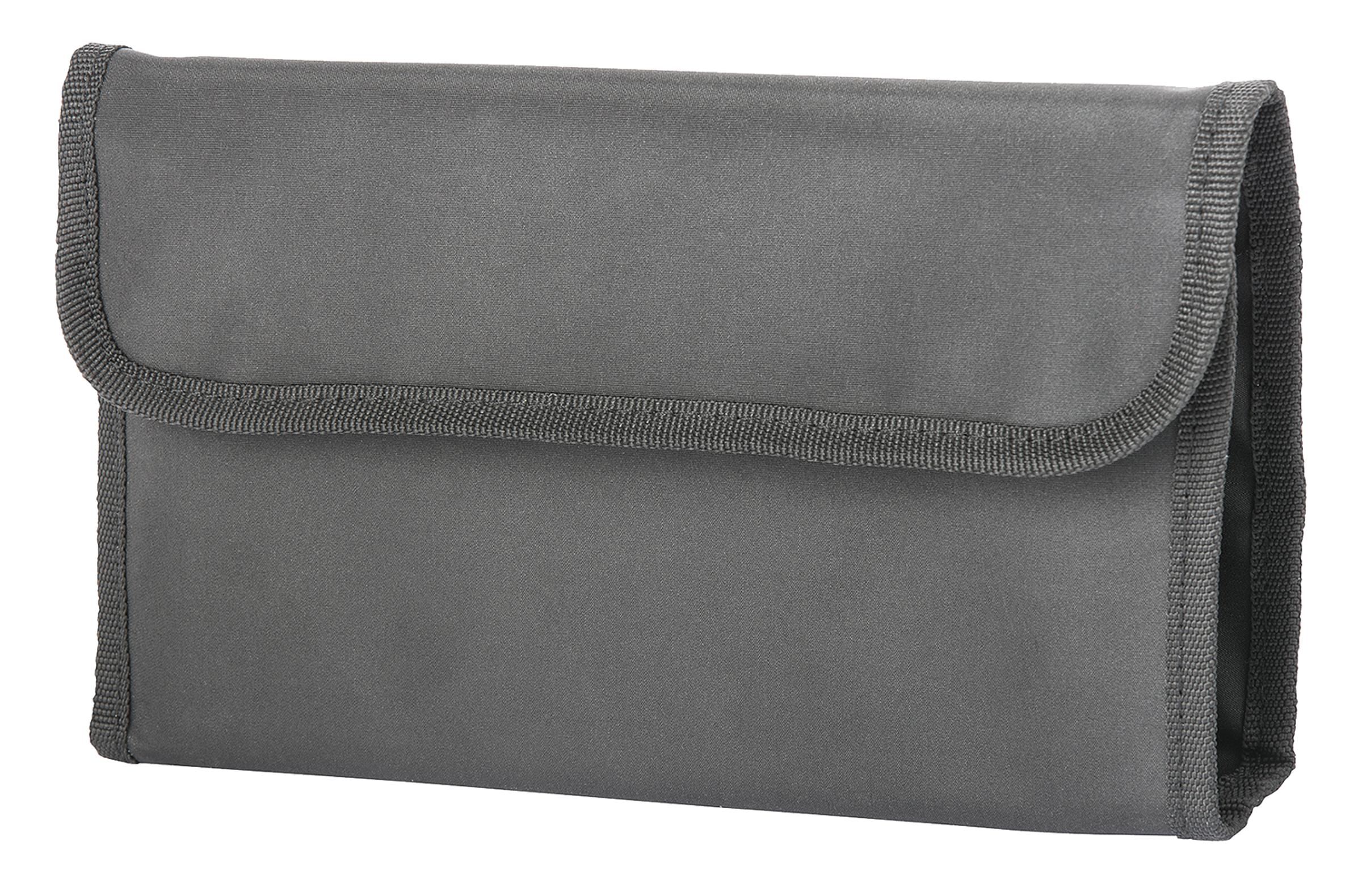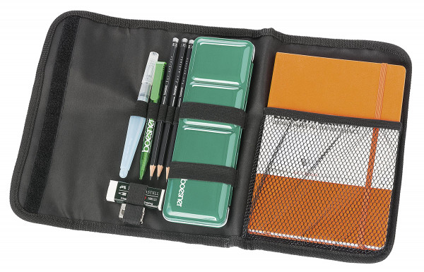 Vom Skizzenbuch über Zeichenstifte, Spitzer und Radiergummi bis hin zu Pinsel und Aquarellkasten: In der Mappe aus festem, schwarzem Nylongewebe lassen sich alle Utensilien zum Zeichnen und Aquarellieren sicher verstauen. Sie ist nicht nur ein praktischer Ordnungshelfer im Atelier, sondern auch ein zuverlässiger Begleiter für unterwegs. Gummischlaufen halten alles an seinem Platz, sicher verschlossen wird die Mappe mit einem Klettverschluss. Ohne Inhalt.