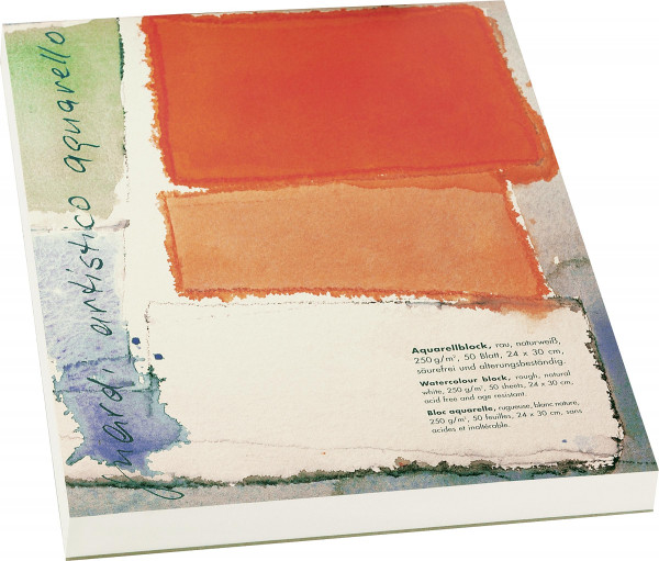 Profi-Aquarellblock mit weißem Aquarellkarton, raue, leicht strukturierte Oberfläche aus hochwertigem, holzfreiem Zellstoff. Rundum geleimt. Säurefrei, farbecht, sehr licht- und alterungsbeständig. Der Karton eignet sich für alle...