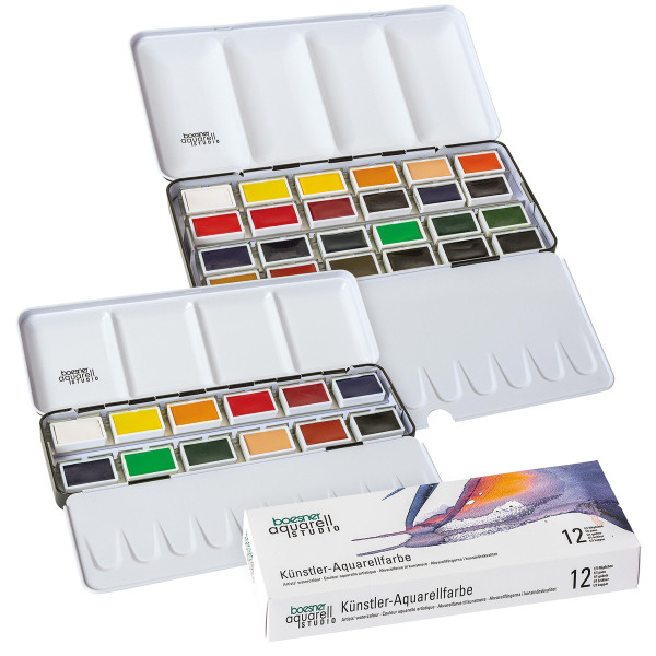 Der 12er-Kasten enthält die Farbtöne Deckweiß, Hellgelb zitron, Goldgelb, Haut, Dunkelrot, Magenta, Ultramarin, Cyan, Hellgrün, Moosgrün, Siena gebrannt und Schwarz. Der 24er-Kasten enthält zusätzlich die Farbtöne Gelb, Orange, Hellrot, Blauviolett, Stahlblau, Türkis, Blaugrün, Oliv dunkel, Ocker, Van-Dyck-Braun, Dunkelbraun und Blaugrau.