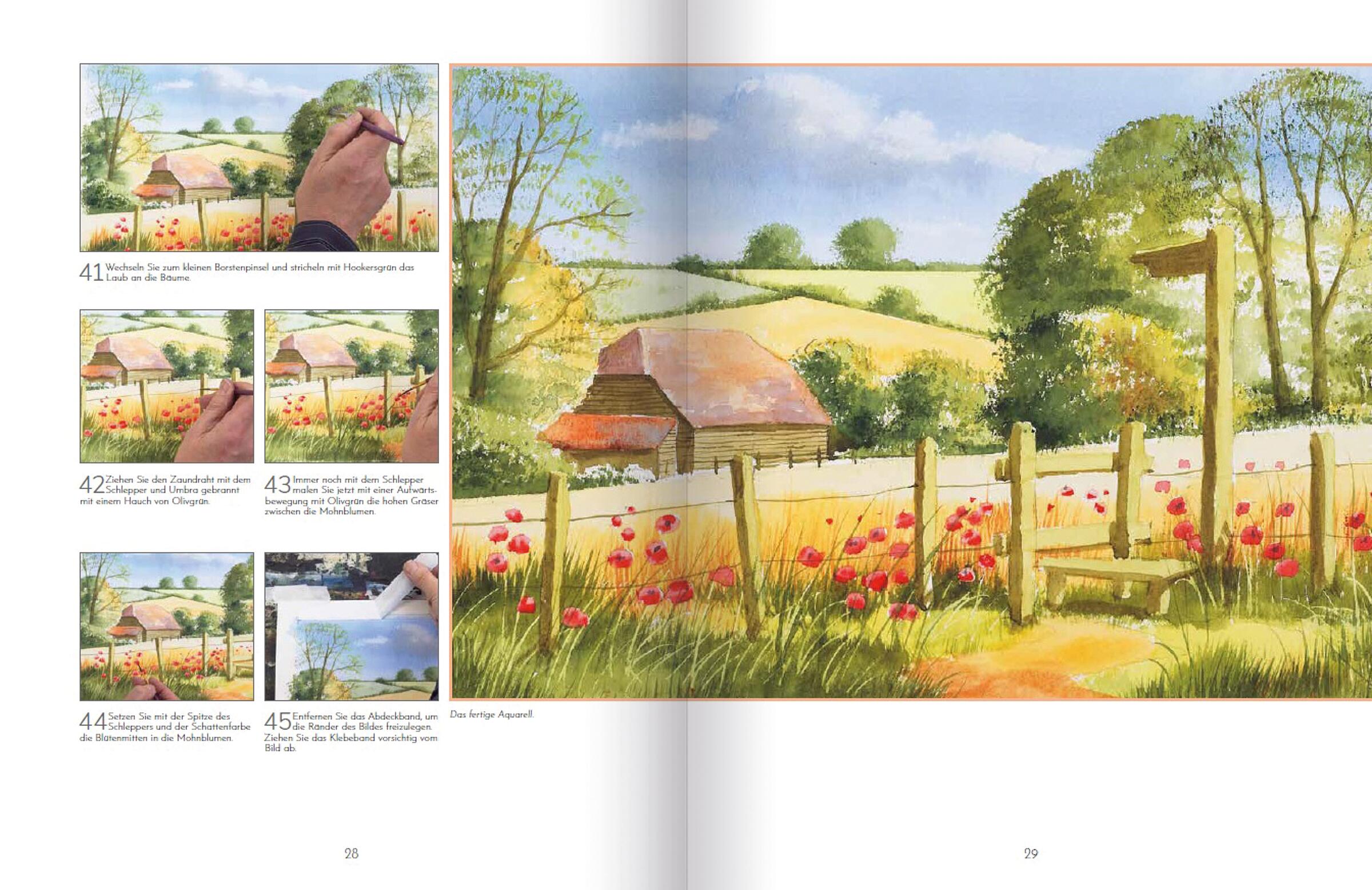 Zauberhafte Malvorlagen des beliebten englischen Aquarellmalers Terry Harrison, Step by Step leicht gemacht. Weite Felder und idyllische Bauernhäuser, leuchtende Mohnblumenwiesen und kleine Flüsse mit romantischen Holzbrücken: In diesem Buch werden 16 zauberhafte Motive gezeigt. Die Bilder sind mit Hilfe heraustrennbarer Vorlagen und sehr detaillierter Arbeitsschritte leicht nachvollziehbar. Anfänger*innen gelingt so ein leichter Einstieg in die Aquarellmalerei und Fortgeschrittene profitieren vom Terry Harrisons reichem Erfahrungsschatz und seinen Aquarelltechniken.