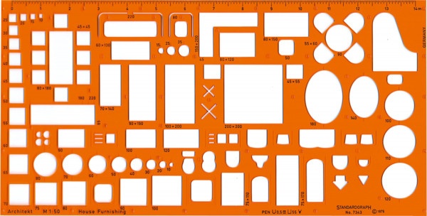 Maßstab 1:50, für Einrichtungspläne im Wohn-, Schlaf-, Küchenbereich und sanitäre Anlagen.
