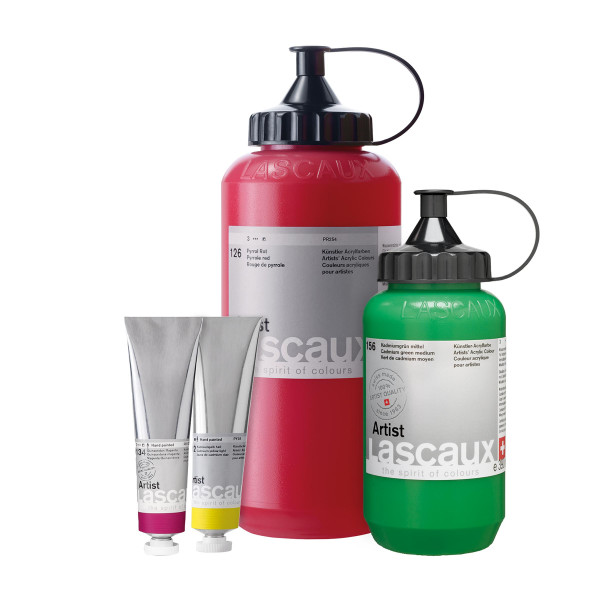 Pastos eingestellte Künstler-Acrylfarbe mit hervorragenden Verarbeitungseigenschaften, die sich im Innen- wie auch im Außenbereich für jede Maltechnik eignet. Lascaux Artist ist lichtecht, alterungsbeständig, auf Wetterechtheit optimiert und vergilbungsfrei. Der getrocknete, elastisch harte Farbfilm kann von Lasuren bis zu schweren Impastos in beliebigen Schichten übermalt werden. Mit dem ausgewogenen Sortiment lassen sich praktisch alle Nuancen ausmischen. Besonders mit den metallisch glänzenden Farben Brillantsilber, Sunshine Gold und King‘s Gold gemischt, lassen sich interessante Effekte erzielen. Sortiment: 57 Farbtöne in 45 ml-Tuben und 54 Farbtöne in 390 ml- und in 750 ml-Flaschen.
