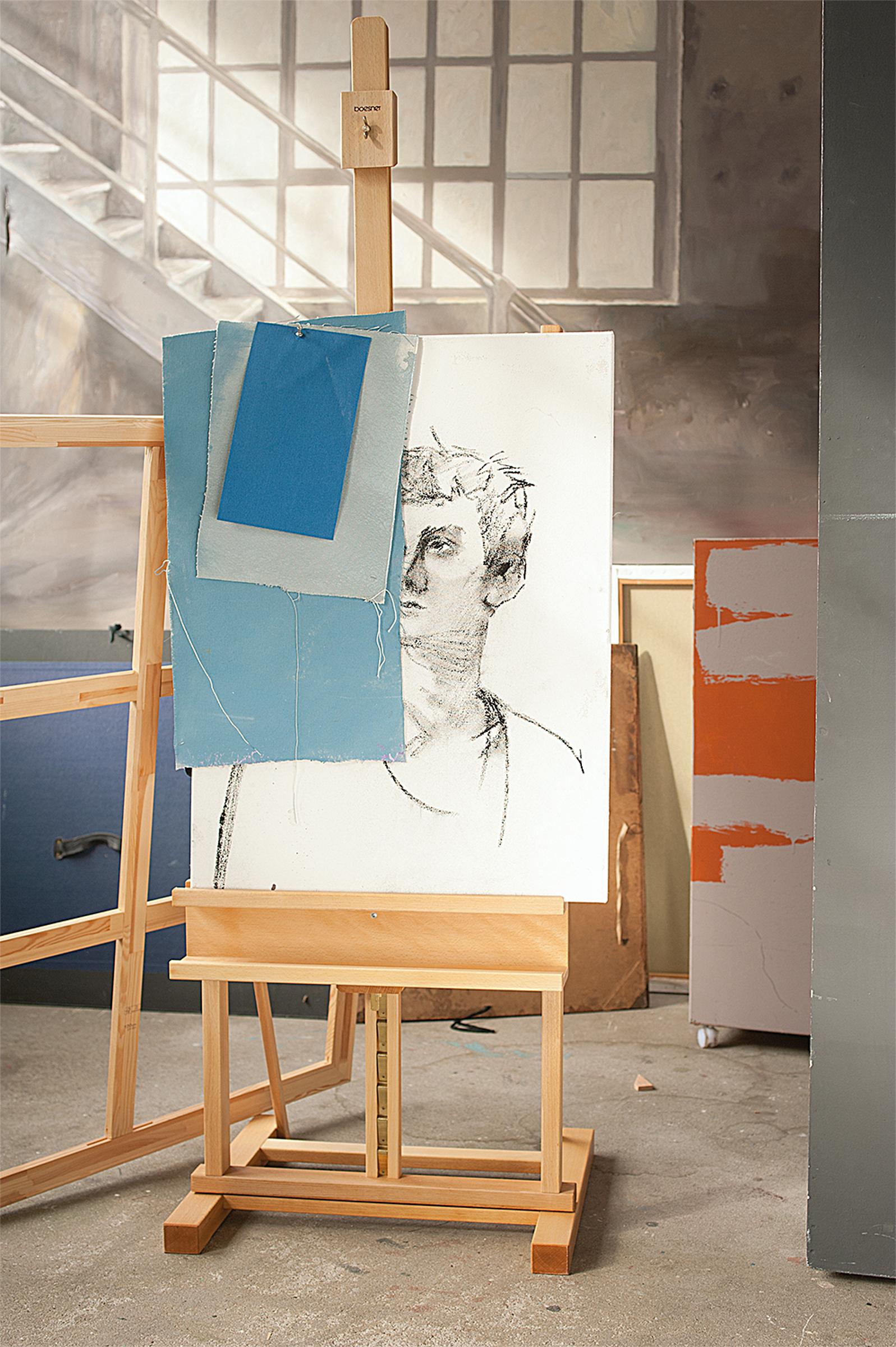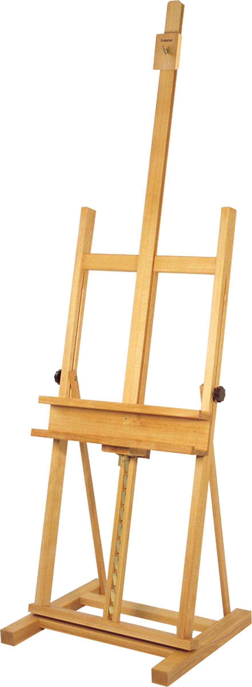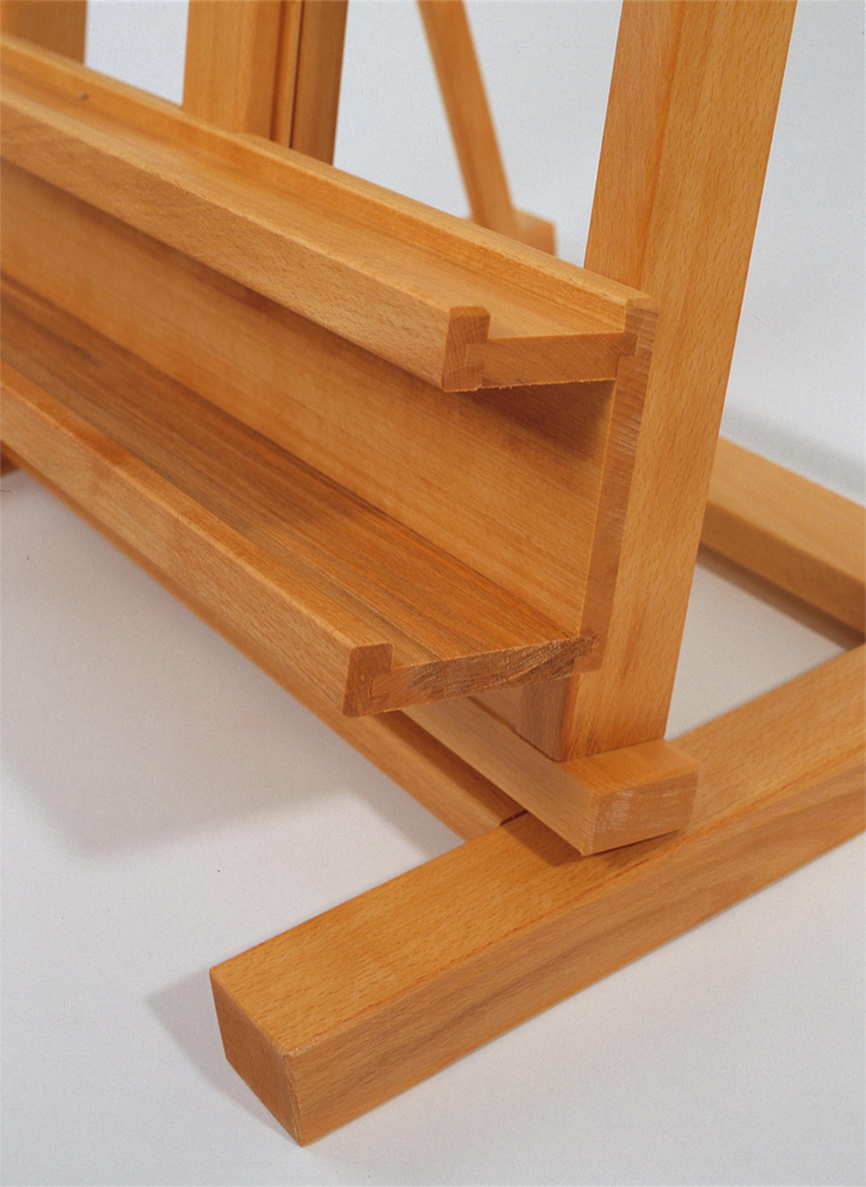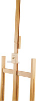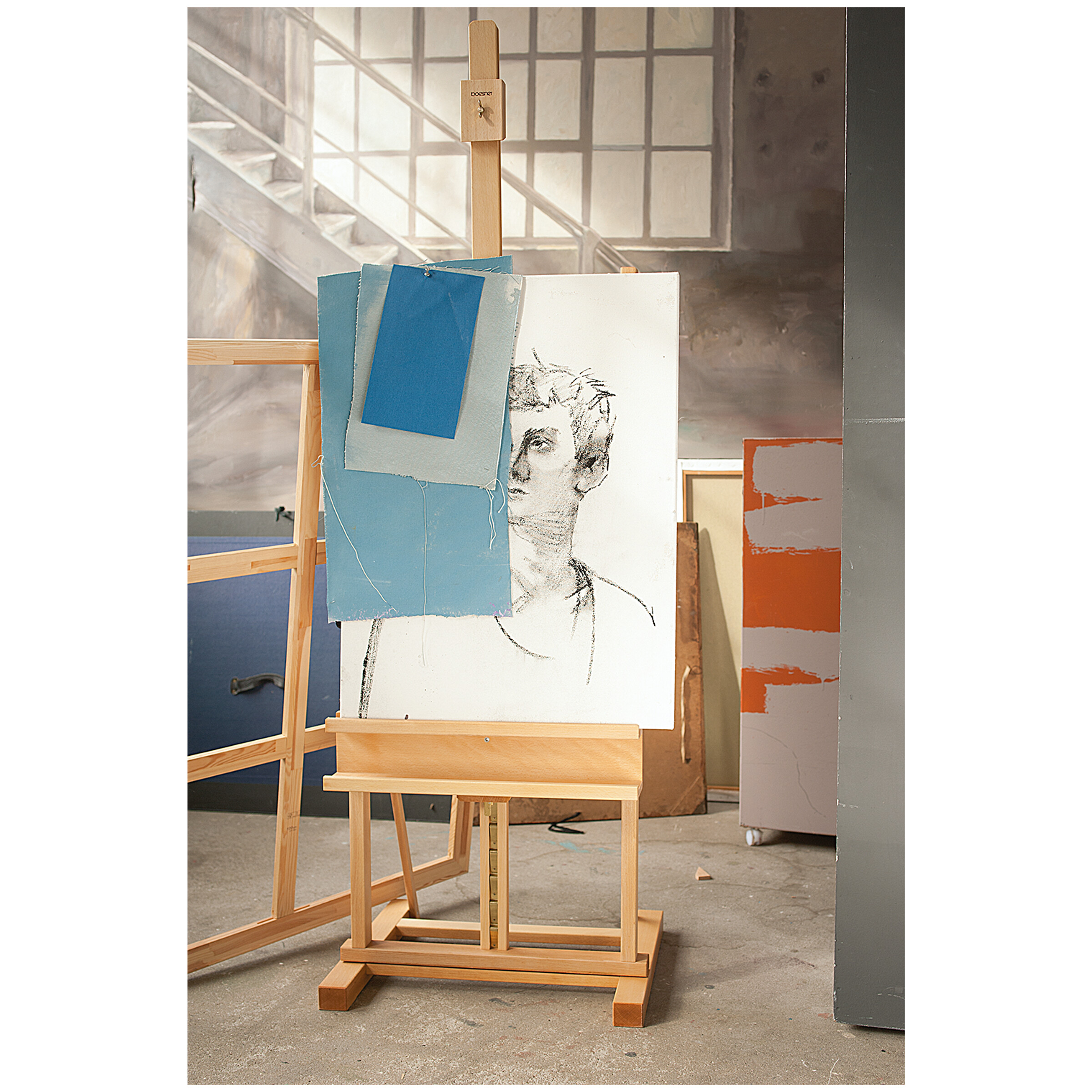 Stabile, zusammenklappbare Atelierstaffelei aus massivem Buchenholz, mit Leinöl getränkt. Die Querverstrebungen sind 3,5 x 5 cm stark, der Tisch mit Doppelablage lässt sich durch Schieben über ein Raster in der Höhe verstellen....
