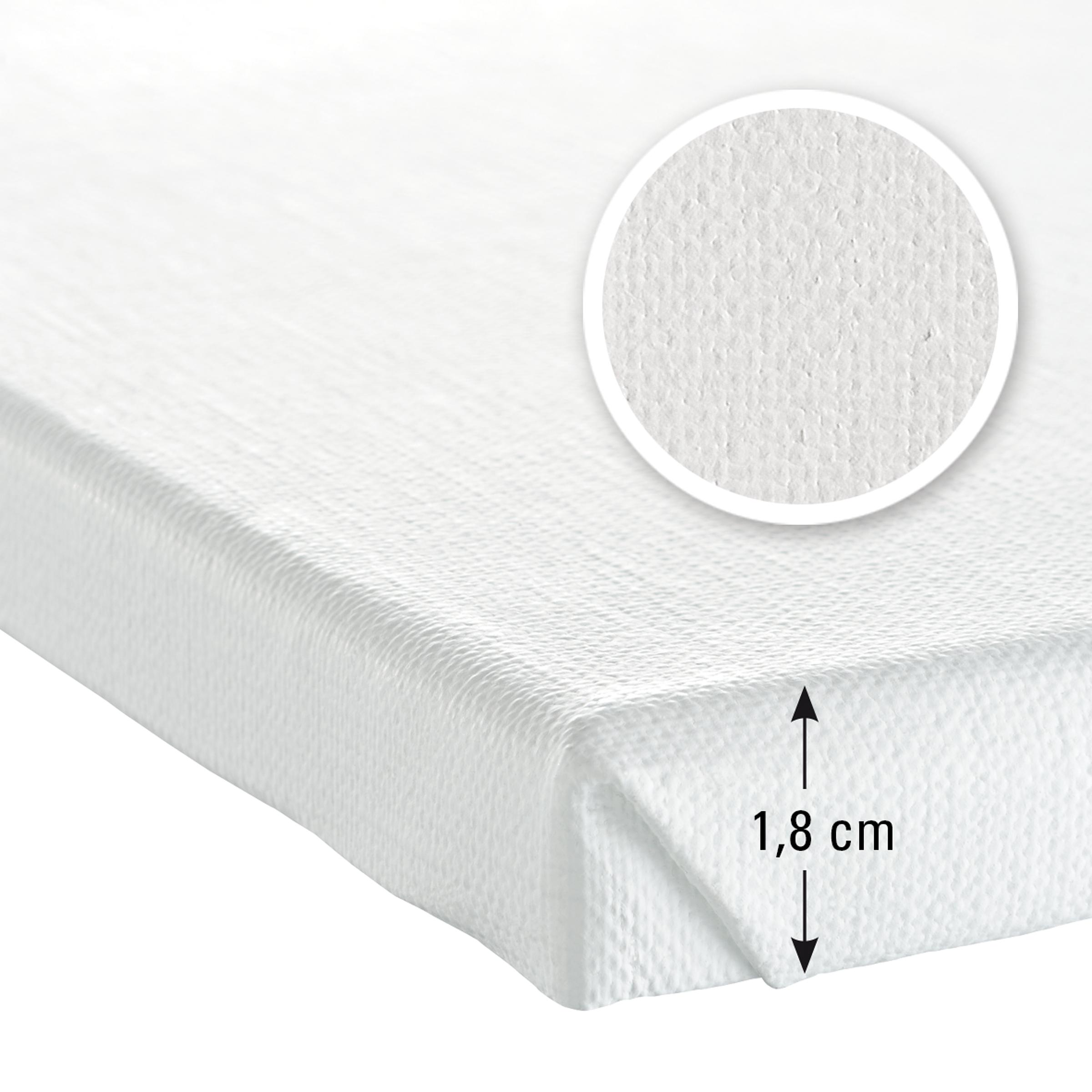 Das sehr reißfeste, haltbare und vierfach grundierte Leinengewebe (Grammatur 450 g/m²) mit mittlerer, gleichmäßiger Struktur ist leicht saugend grundiert, nach hinten umgeschlagen und nur rückseitig geklammert. Durch Keile kann die Gewebespannung korrigiert werden. Die Keilrahmenleisten haben eine Tiefe von ca. 1,8 cm. In 14 Formaten lieferbar. Durch seinen konkurrenzlosen Preis ist der Eco 100L-Keilrahmen besonders für Großverbraucher interessant. Bei Abnahme ganzer Pakete ist der Preis nochmals um ca. 5 % reduziert.