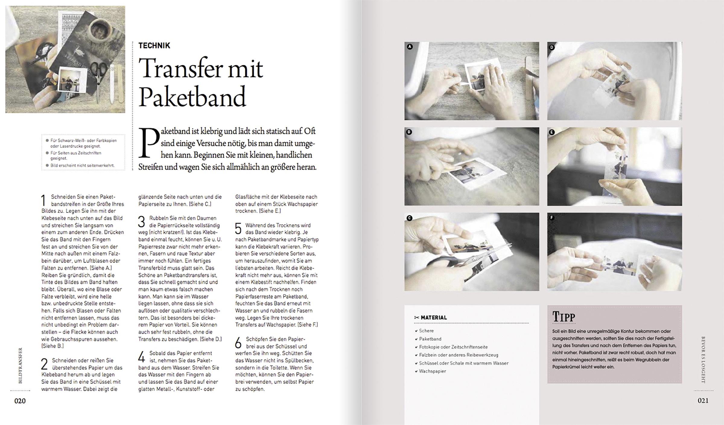 Instagram-Fotos, Buchillustrationen oder Zeichnungen – beliebige Bilder können mit Bildtransfertechniken reproduziert und auf unterschiedlichste Untergründe gebracht werden. Das Buch leitet nach einer Einführung in das Material, die Bildgründe und fünf Basistechniken des Transferierens Schritt für Schritt zu 19 Projekten an.