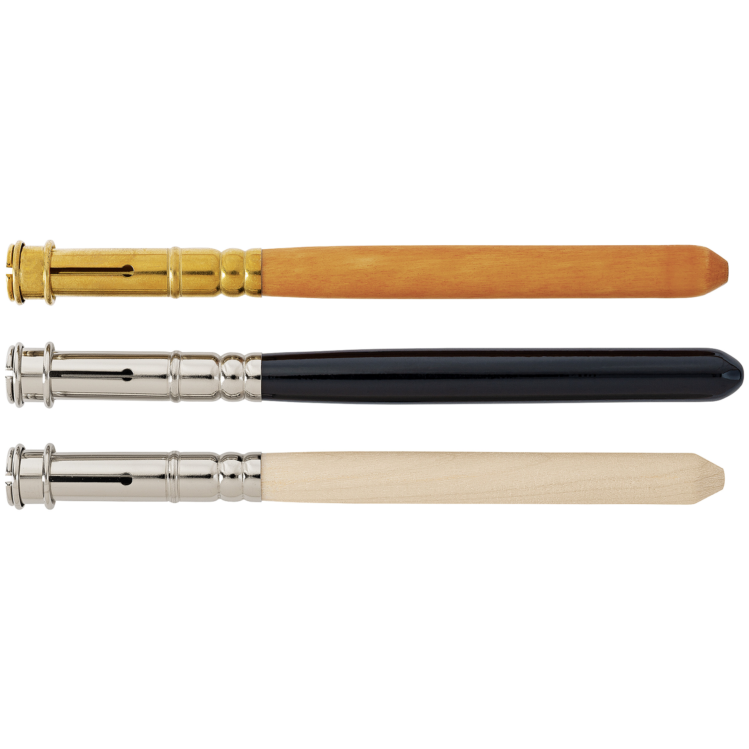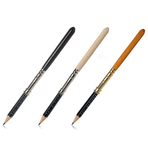 Für Zeichen- und Bleistifte in normaler Stärke. Holzstiel mit Hülse und verstellbarem Klemmring.