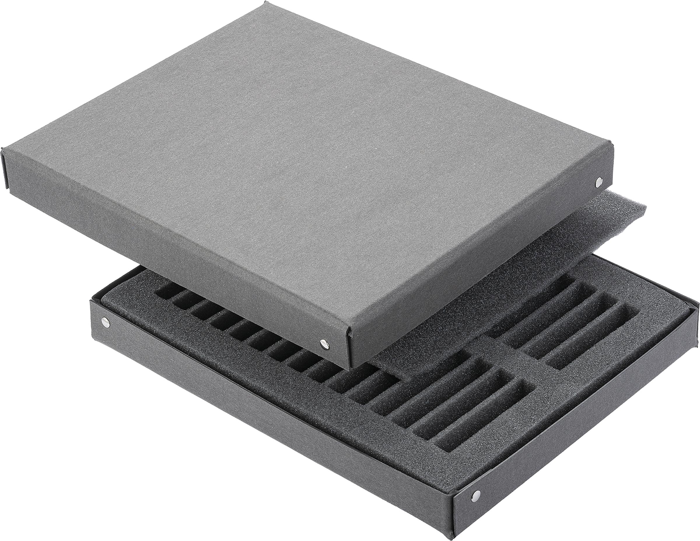Passgenaue Sonderanfertigung zur Aufnahme des Schaumstoffinletts für die sichere Aufbewahrung von Pastellen. Die stabile und haltbare Kartonage der Black Box wird umweltfreundlich aus 100 % Altpapier hergestellt. Format: 23 x 28 cm. Ohne...