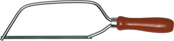 Bügelsäge mit Stiftsägeblatt für kleine Arbeiten mit Metall, Ausladung 45 mm, 148 mm Stiftabstand, Rundstahl 6mm, vernickelt, mit Buchenholzheft. Ersatzsägeblätter, sowie Sägeblätter für Arbeiten mit Holz sind in separat erhältlich.