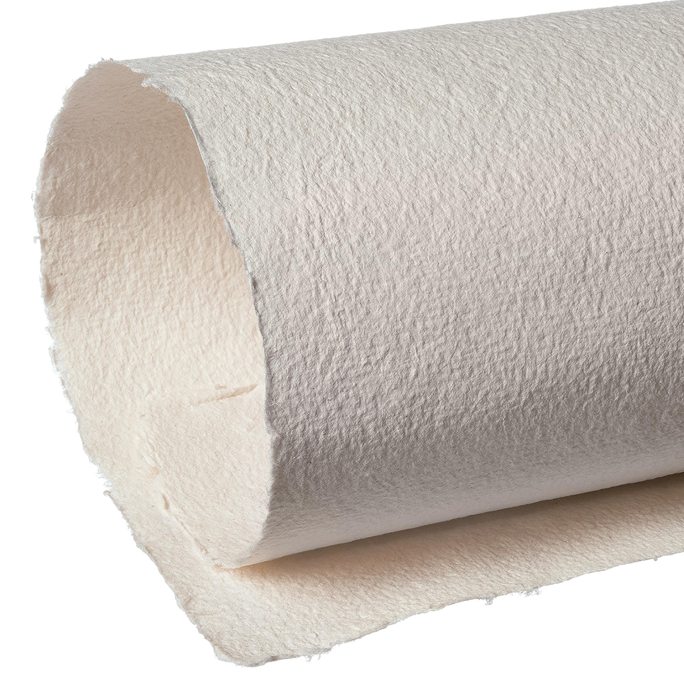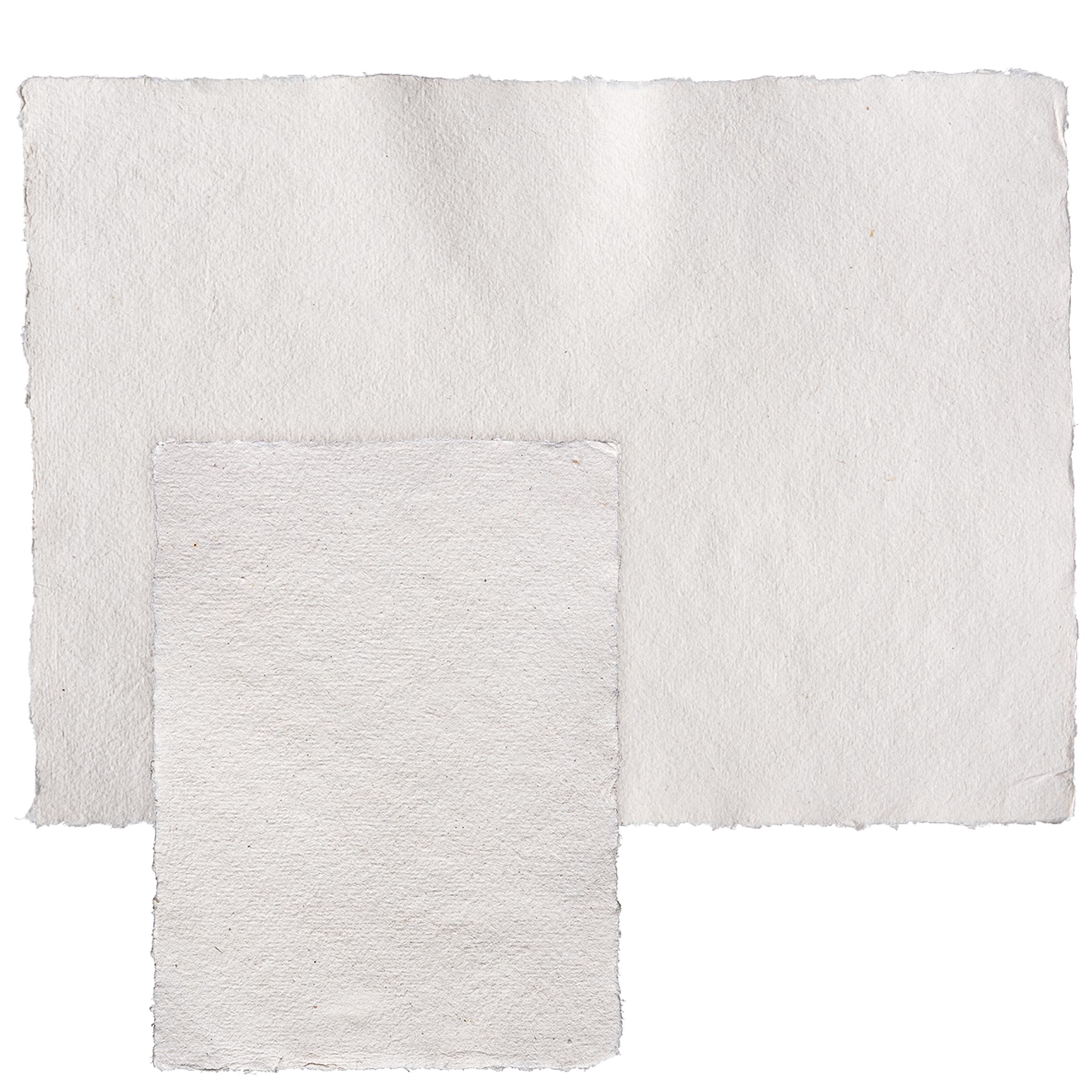 Hergestellt aus 100 % Baumwolle. Lebhafte, unregelmäßige Struktur. 4-seitiger Büttenrand. Von Hand aus der Bütte geschöpft, Bögen werden im Nasszustand gerissen.