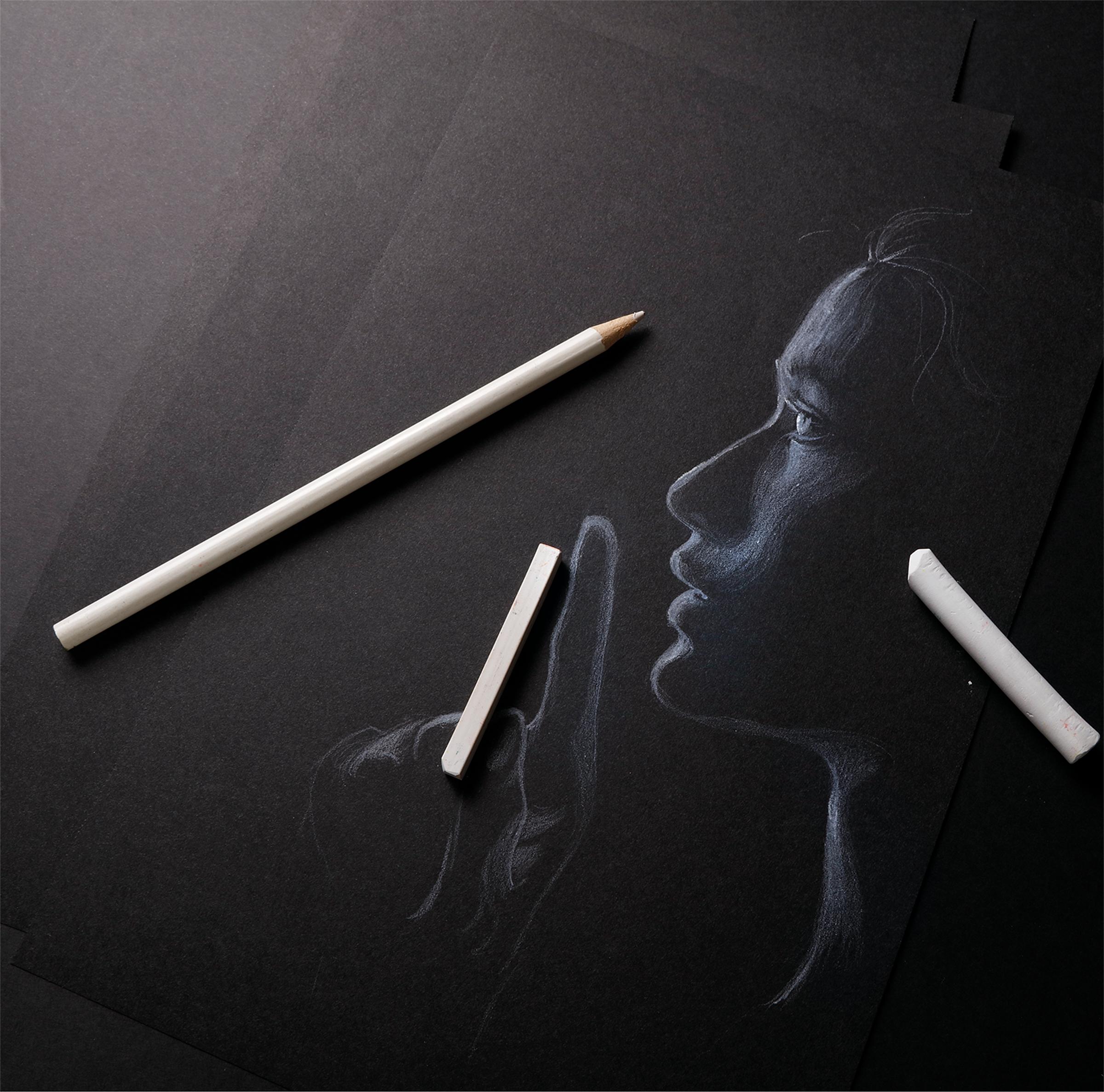 Tiefschwarzes, in der Masse durchgefärbtes Papier (120 g/m²) mit sehr feinkörniger Struktur. Das lichtechte Papier eignet sich für Trockentechniken wie Stift-, Filzstift-, Kreide-, Rötel-, Sepia-, Zeichentusche- oder Pastellzeichnungen. Weißen Tinten- und Gouachezeichnungen verleiht es als kontrastfarbener Untergrund einen besonderen Farbakzent.