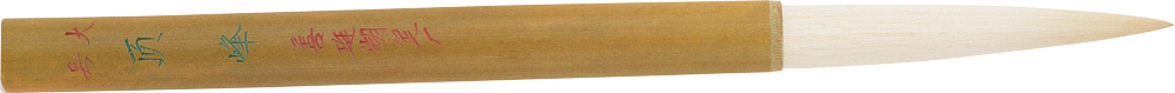 MehrKräftiger Ziegenhaarpinsel mit weißem, langem Haar. Haarlänge ca. 9,7 cm, Stiellänge 21,5 cm, Durchmesser 1,9 cm. Der dicke Bambusstiel ist mit roten und grünen Schriftzeichen verziert.