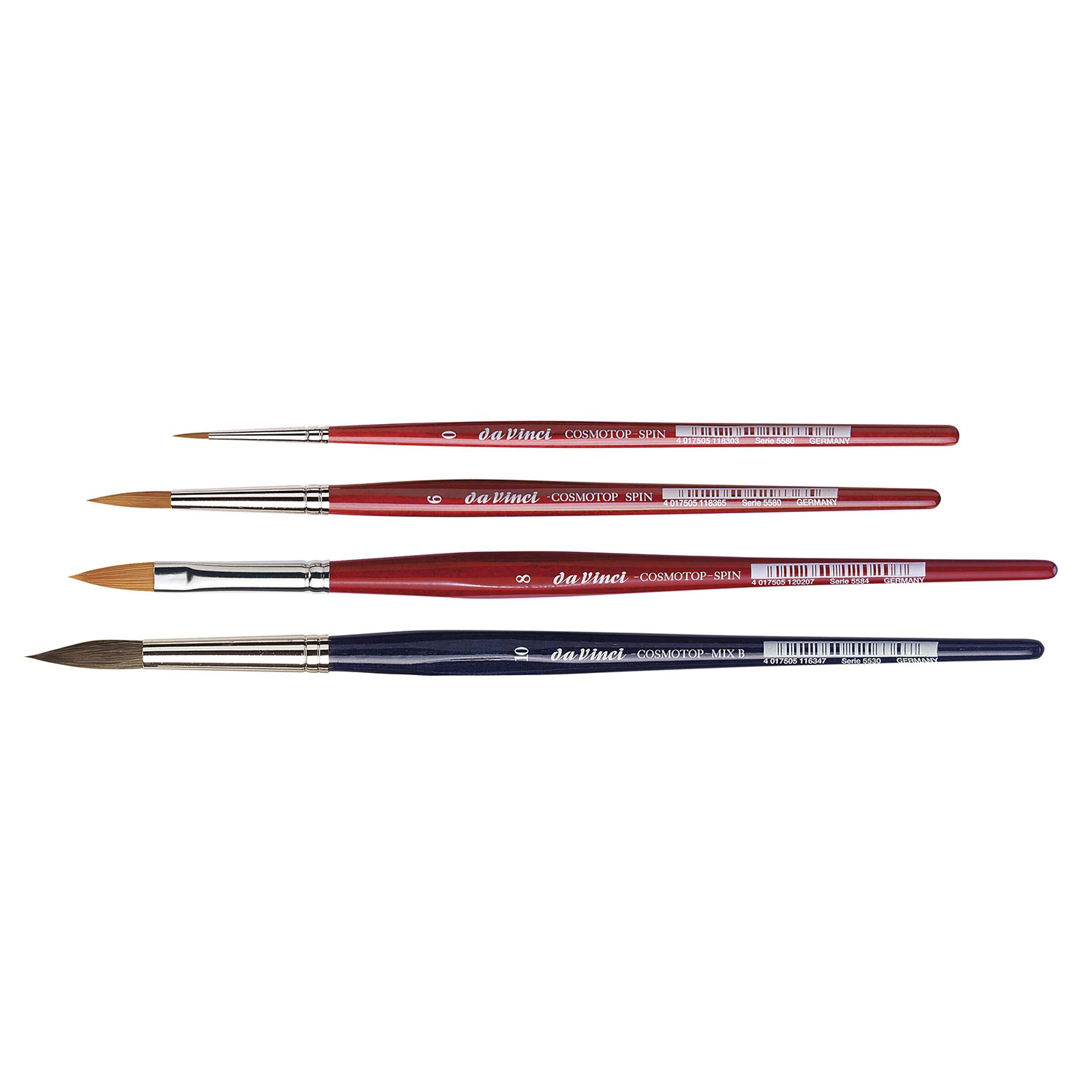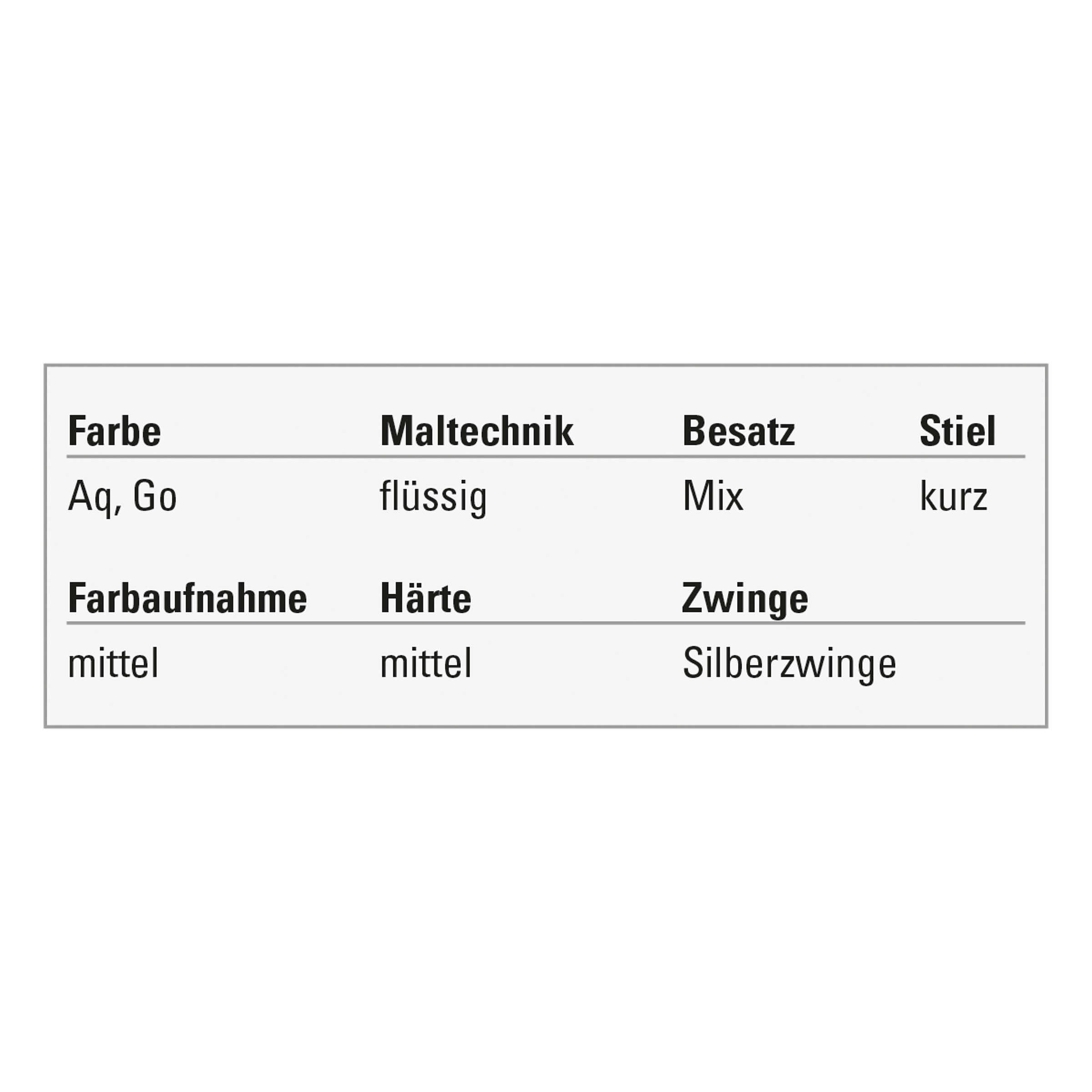 Das Aquarellpinsel-Set besteht aus vier Pinseln mit ergonomischen Esagonalstielen und besonders farbaufnahmefähigem Besatz. Enthalten sind ein Rundpinsel der Cosmotop-Mix B Serie 5530 in Größe 10, je ein Rundpinsel der Cosmotop-Spin Serie 5580 in Größe 0 und 6 sowie ein Ovalpinsel der Cosmotop-Spin Serie 5584 in Größe 8. Der Besatz der Cosmotop-Mix B Serie 5530 besteht aus einer Komposition klassischer Naturhaare (Marder, Feh, Iltis) mit hoch elastischen Kunstfasern, die Pinsel der Cosmotop-Spin-Serien sind mit extrafeinen, sehr geschmeidigen Synthetikfasern besetzt. Made in Germany.