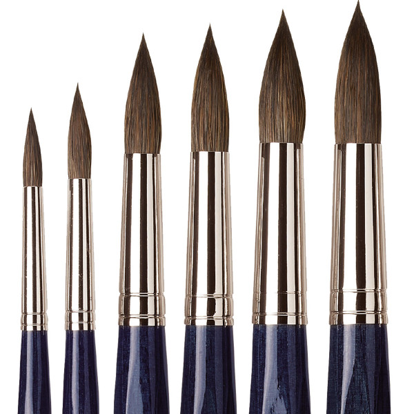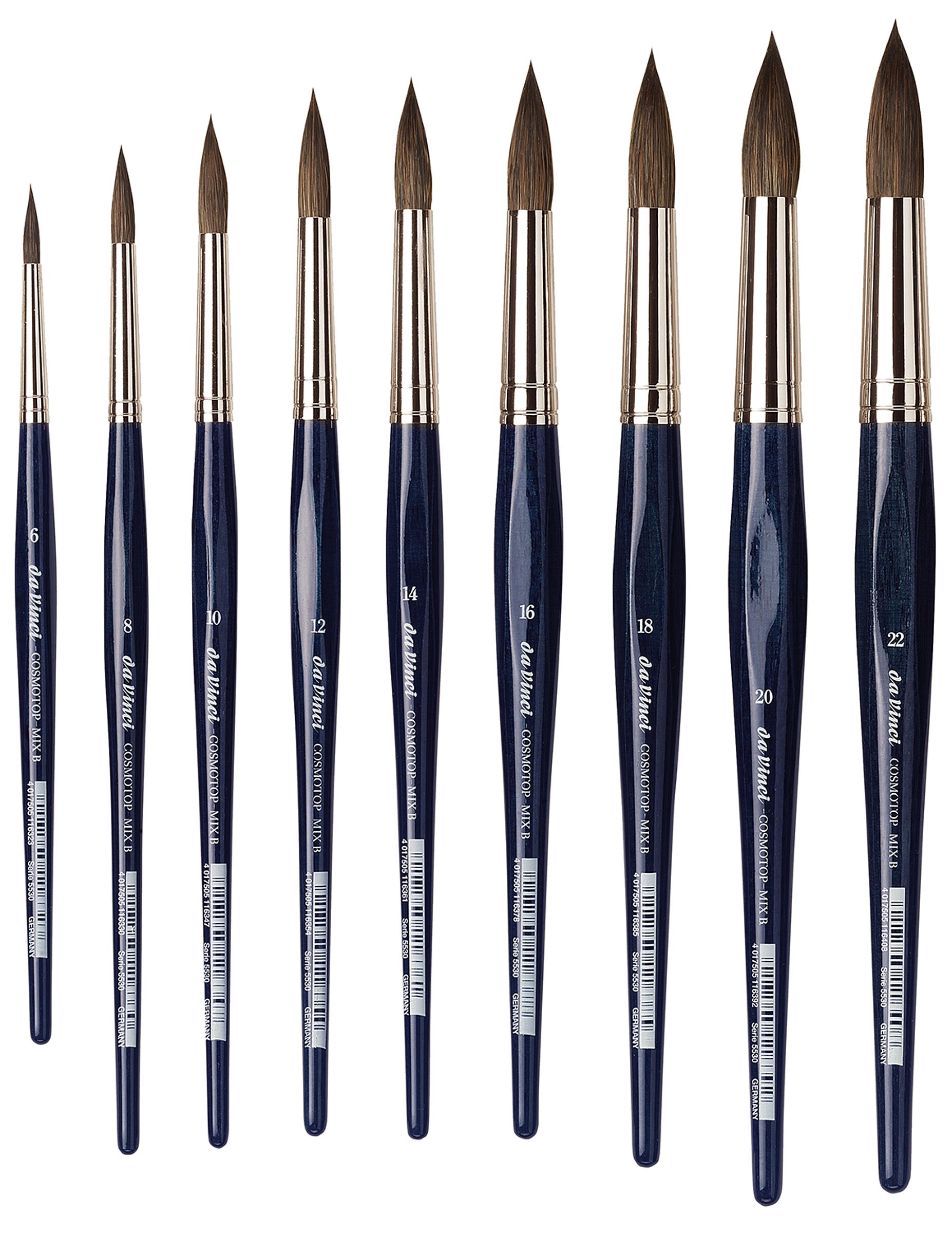 Die runden Aquarellpinsel der Cosmotop Mix B-Serie bestehen aus einer Komposition klassischer Naturhaare von Marder-, Feh und Iltis in Verbindung mit hoch elastischen Kunstfasern. Dadurch vereinen sie die saugenden Eigenschaften der Naturhaare mit der stabilen Form eines Synthetikpinsels. Made in Germany