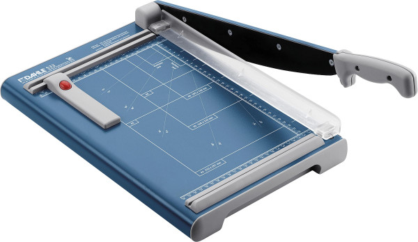 Die Hebel-Schneidemaschine mit geschliffenen und geschraubten Ober- und Untermessern aus hochwertigem Stahl ermöglicht bei geringem Kraftaufwand den präzisen Schnitt von Papier und Karton. Mit manueller Pressung, integriertem Fingerschutz, stabilem Metalltisch mit abgerundeten Kanten und Formatlinien, verstellbarem Rückanschlag, 2 Winkelanlagen mit mm-Skala sowie ergonomisch geformten Handgriffe.