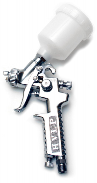 Professionelle Airbrush-Pistole mit 0,5 mm-Düse für mittlere bis großflächige Arbeiten wie z. B. Urban Art, Graffiti, Hintergründe, Beschriftung, Tattoos, Bodypainting, Designlackierung usw. Geeignet sowohl für die Verwendung lösungsmittelhaltiger Farben und Lacke als auch für die Verarbeitung stark pigmentierter und dickflüssigerer Künstlerfarben. Sprühwinkel, Nadelregulierung sowie Luftmengenverbrauch sind einstellbar, um einen entsprechend der Konsistenz der verwendeten Farbe optimalen Auftrag zu erzielen. Der große lösungsmittelbeständige Farbbehälter fasst 125 ml und erlaubt zügiges Arbeiten. Umrüstbar auf 1 mm-Düse für großflächigere Arbeiten und dickflüssigere Farben. Luftmengenverbrauch: ca. 30 bis 45 l/min, entsprechend dem eingestellten Sprühwinkel und Ausgangsdruck.