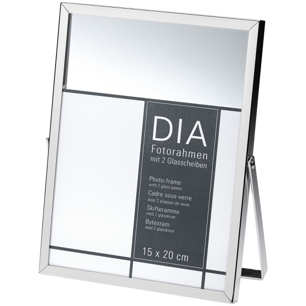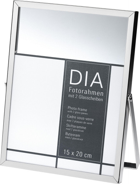 Der Fotorahmen in spiegelnder Chromoptik hat keine Rückwand, stattdessen wird das zu rahmende Bild oder Foto zwischen zwei Glasplatten fixiert. Das Rahmenformat ist jeweils etwas größer als die angegebenen Bildformate (umlaufend 2,5 bzw. 2 cm). So entsteht, je nach Größe des Bildes, ein durchsichtiger „Rahmen im Rahmen“. Mit Aufstellbügel zur Verwendung im Hochformat.