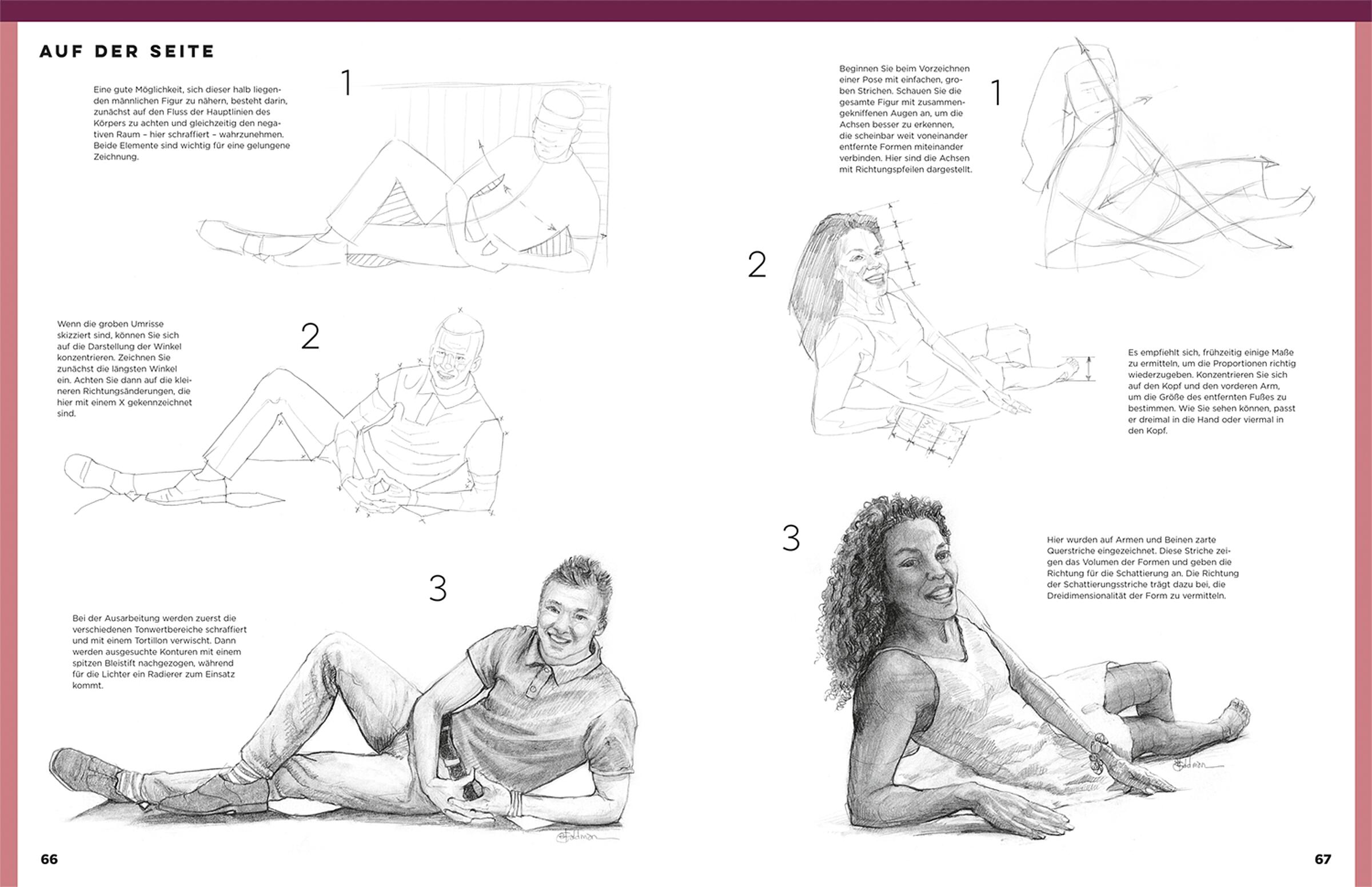 Von einfachen statischen Körperhaltungen über Figuren in Bewegung bis hin zu ausdrucksstarken Porträts. Über 30 Schritt-für-Schritt-Projekte für Einsteiger*innen und Fortgeschrittene vermitteln alle wichtigen Grundlagen zu Anatomie, Proportionen, Schattierungen, Perspektive und Komposition.