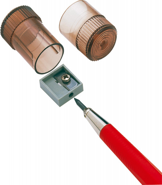 Dosenspitzer mit herausnehmbarem Kunststoffspitzer mit aufgeschraubtem Metallmesser, Auffangdose aus stabilem Kunststoff, Höhe 2,9 cm, Ø 1,7 cm.