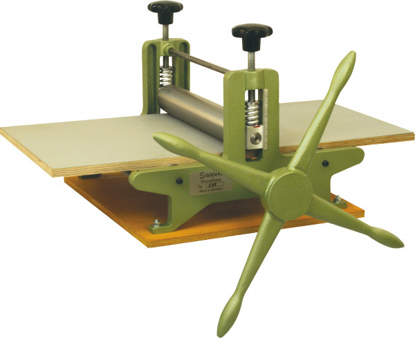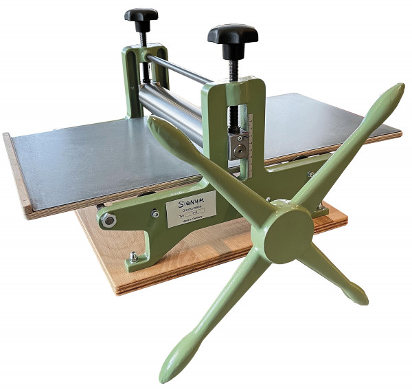 Die Seitenteile der Signum 315 bestehen aus hochbelastbarem, formstabilem Aluminiumguss. Die untere Walze wird über ein 4-Stern-Rad angetrieben und ist der besseren Griffigkeit wegen gerändelt. Abstand und Druck der Stahlwalzen werden über zwei große Gewindespindeln geregelt. Die obere Walze ist federnd gelagert und passt sich den Unebenheiten des Materials an. Ein spezielles Hebesystem verhindert das dauerhafte Aufliegen der Oberwalze auf der Druckplatte und erleichtert das Einführen der Platte in die Presse. Außer für Holzschnitt, Linolschnitt und Lithografie eignet sich die Presse ausgezeichnet für Materialdrucke (mit Stoff, Kork, Tapete, Federn, Fell, Metall, Blättern, Gräsern etc.). Den Druckschlitten bilden ein mehrfach verleimter Holzdrucktisch (aus Multiplex) und eine elektrolytisch verzinkte Stahlplatte (jeweils mit Anschlag), die präzise und reibungsarm auf 4 Rollen gleiten. Die Signum 315 wird auf einer stabilen lackierten oder lasierten Holzplatte geliefert. Inkl. Druckfilz (weiß, weich, 5,0 mm, nach DIN 61206). Für DIN A3.