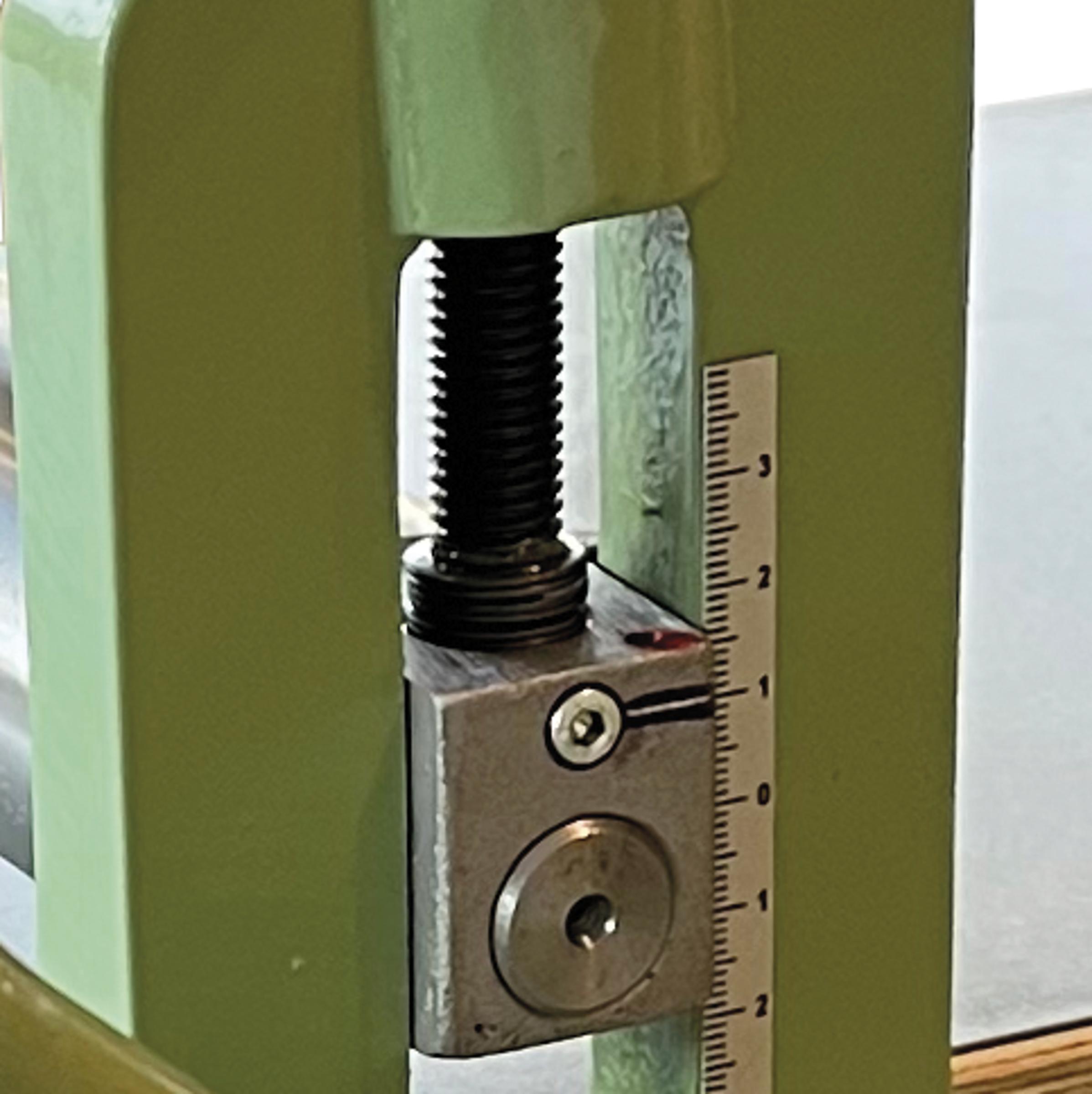 Technische Daten: Walzendurchmesser: oben 50 mm/unten 40 mm Walzenlänge: 300 mm (beide Walzen aus massivem Stahl, untere Walze gerändelt) Tischbreite: 300 mm Tischlänge: 600 mm Gewicht: ca. 15 kg max. Anpressdruck: 1.000 kg Durchgangshöhe: ca. 45 mm Untersetzung: Ohne Untersetzung