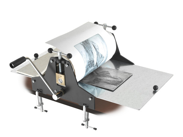 Die Walzendruckpresse mit Kurbelantrieb und Metall-Druckplatte eignet sich für alle üblichen Drucktechniken wie Linol- und Holzschnitt. Ober- und Unterwalze bestehen aus Massivstahl ohne Hohlraum, dies gewährleistet eine gleichmäßige Druckstärke. Die Druckeinstellung erfolgt über leichtgängige Gewindespindeln. Für sicheren Halt lässt sich die Druckpresse mit separat erhätlichen Schraubzwingen (Bestell-Nr.: FSZ3623012) am Tisch fixieren.
