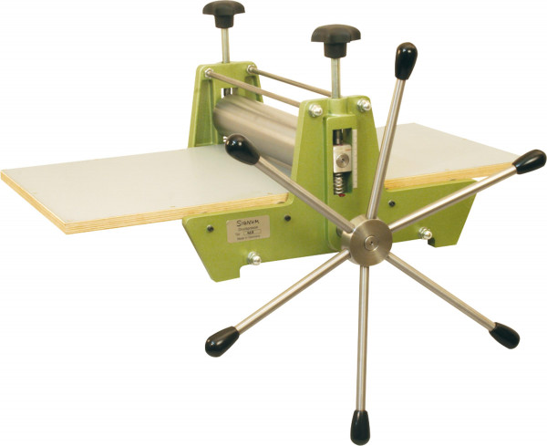 Solides Gerät mit Seitenständern aus hoch belastbarem, stabilen Aluguss mit 6-Speichenantrieb und einem dreizehnfach verleimten Holzdrucktisch (Multiplex) mit aufgeschraubter, elektrolytisch verzinkter Stahlplatte. Der Drucktisch gleitet reibungsarm und präzise auf speziellen Führungen. Die Oberwalze ist starr gelagert. Die Druckeinstellung erfolgt über Gewindespindeln mit großen Griffen. Der Antrieb läuft über die untere Walze. Dadurch eignet sich das Gerät insbesondere für Holzschnitt, Linolschnitt etc., selbstverständlich aber auch für Radierungen. Inkl. Druckfilz weiß, weich, 1,5 mm, nach DIN 61206.