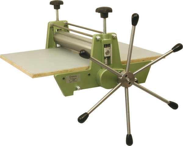 Hochwertiges, solides Gerät mit Zahnradgetriebe zum Antrieb der Unterwalze. Auch für Radierungen gut geeignet. Die Seitenständer bestehen aus hochbelastbarem Aluminiumguss, veredelt mit einer hochwertigen Pulverbeschichtung. Der Holzdrucktisch ist dreizehnfach verleimt (Multiplex) und mit einer aufgeschraubten elektrolytisch verzinkten Stahlplatte bewehrt. Er gleitet reibungsarm und präzise durch die Presse. Der Walzendruck wird über Einstellspindeln mit Druckfedern erzeugt, der Antrieb erfolgt über die Unterwalze. Auch bei höchstem Walzendruck ist die Presse durchdas neu entwickelte Planetengetriebe leichtgängig und sicher zu handhaben. DIN Format: A3–A2. Inkl. Druckfilz (weiß, weich, 5,0 mm nach DIN 61206).