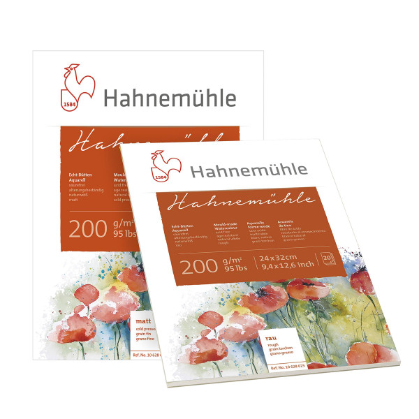 Naturweiße, hochfeine Qualität, rundum mit einem Gazestreifen neutralgeleimt, säurefrei und alterungsbeständig. Der klassische Echt-Bütten Aquarellblock in den Ausführungen matt (mit leicht unregelmäßiger Gewebestruktur) und rau (unregelmäßige Struktur).