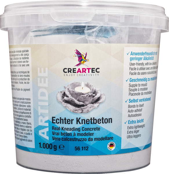 Das geschmeidige Material lässt sich wie Knetmasse formen und eignet sich zum Modellieren von Objekten oder Skulpturen. Bei der Verarbeitung ist lediglich das Nassmachen der Finger erforderlich, damit der Knetbeton über 2 Stunden beliebig formbar bleibt und individuell bearbeitet werden kann. Das fertige Objekt härtet an der Luft innerhalb von 2 Tagen vollständig aus. Danach empfiehlt sich das Überstreichen mit Gießmassen-Malgrund. Im Anschluss kann das Objekt mit allen Acryl- oder Wasserfarben bemalt oder lackiert werden. Der Knetbeton ist schadstofffrei und kann daher auch von Kindern und Jugendlichen bedenkenlos verarbeitet werden. Nach dem Vermischen mit Wasser wird das Produkt steinhart und sehr bruchstabil. Verpackt im wiederverschließbaren Behälter.