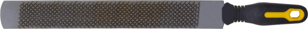 Eine Seite mit extra grobem Raspelhieb für hohen Materialabtrag, die andere Seite mit Feilenhieb für feinere Oberflächenarbeiten. Hieblänge 35 cm. Der ergonomische 2-Komponenten-Kunststoffgriff (schwarz/gelb) ermöglicht ein ermüdungsfreies Arbeiten mit bester Handkraftübertragung.