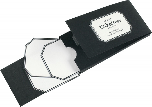 Gummierte, achteckige Etiketten im Retro-Look, die der Etikettierung alter französischer Apothe-kergläser nachempfunden sind. Zur stilvollen Beschriftung von Zeichenbüchern, Heften, Black Boxes und anderen Schachteln, Apothekergläsern, Vorratsbehältern, Beuteln u.v.m. Die Etiketten werden nur leicht befeuchtet und aufgeklebt. Das matte, elfenbeinfarbige 80 g/m²-Papier der Etiketten ist mit einem schwarzen, doppelten Schmuckrand gerahmt. Das Set in der schwarzen Faltschachtel beinhaltet 160 Etiketten (80 Stück à 7 x 4,5 cm, 80 Stück à 9 x 7 cm).