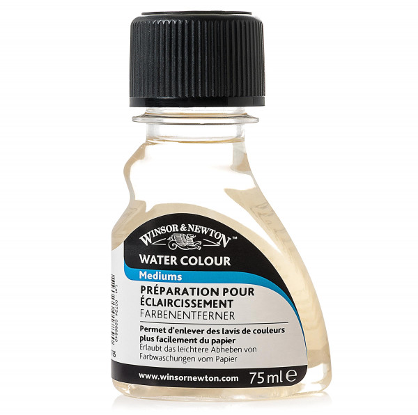 Mithilfe des Farbenentferners können trockene Farbaufträge, einschließlich Tönungs- und Beizfarben, mit einem feuchten Schwamm oder einem nassen Pinsel leichter vom Papier abgehoben werden. Er ist daher ideal für Korrekturen.