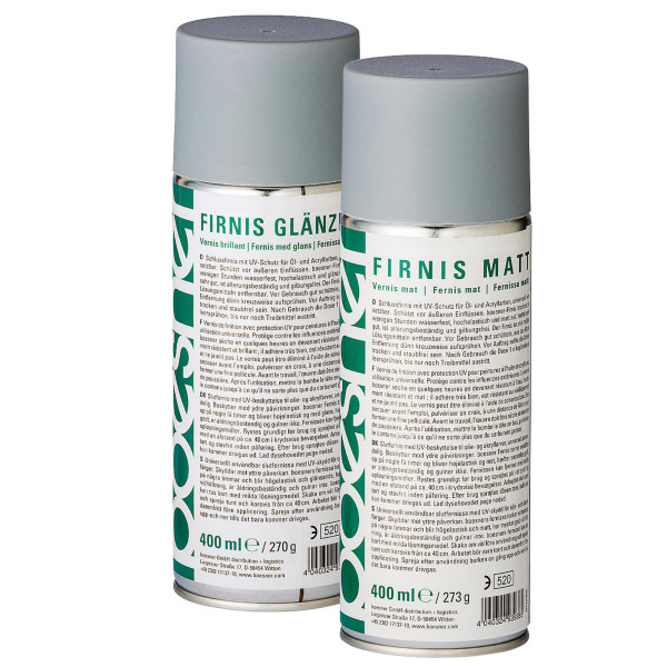 Schlussfirnis mit sehr hoher UV-Beständigkeit für Öl- und Acrylfarben, universell einsetzbar. Schützt vor äußeren Einflüssen. boesner Firnis matt oder glänzend trocknet in wenigen Stunden und ist hochelastisch, haftet sehr gut, ist alterungsbeständig und gilbungsfrei. Der Firnis ist mit milden Lösungsmitteln entfernbar. Vor Gebrauch gut schütteln, aus ca. 40 cm dünn kreuzweise aufsprühen. Vor Auftrag sollte die Arbeit trocken und staubfrei sein. Nach Gebrauch kurz kopfstehend sprühen, bis nur noch Treibmittel austritt. Außergewöhnlich gutes Preis-Leistungs-Verhältnis.