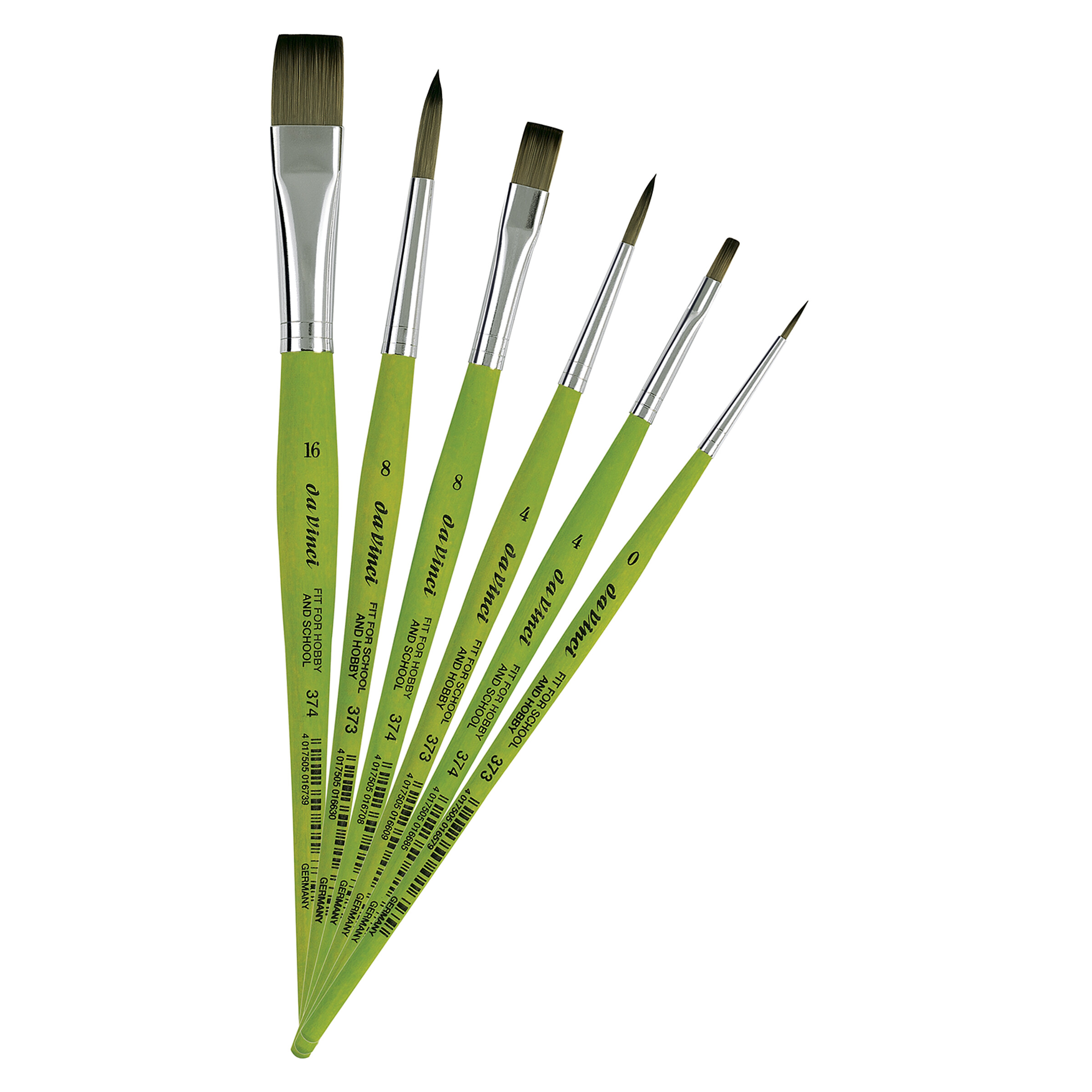 Set mit 3 Rundpinseln (Serie 373) in Gr. 0, 4 und 8 sowie 3 Flachpinseln (Serie 371) in Gr. 4, 8 und 16.