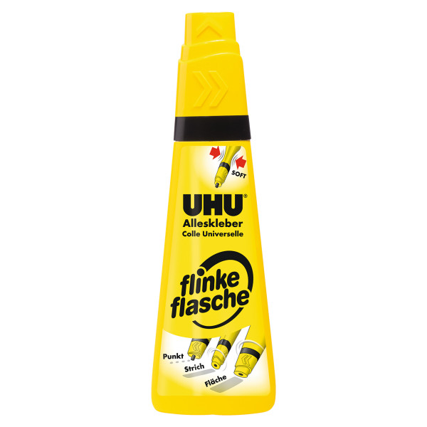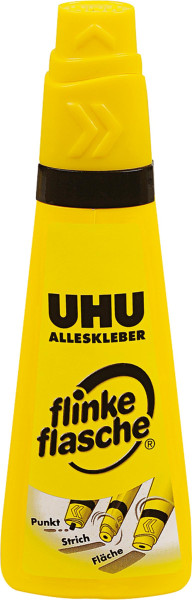 Der bewährte Alleskleber in der weichen, handlichen Flasche mit dem einzigartigen Drehklebekopf für Punkt-, Strich- und Flächenkleben. Klebstoff für die universelle Anwendung in Schule, Haushalt und Büro, beim Basteln, Werken etc. Bei 60 °C auswaschbar. Flinke Flasche macht Kleben besonders einfach. Die einzigartige 90 g-Flasche ist leicht nachfüllbar (760 g-Nachfüllflasche).