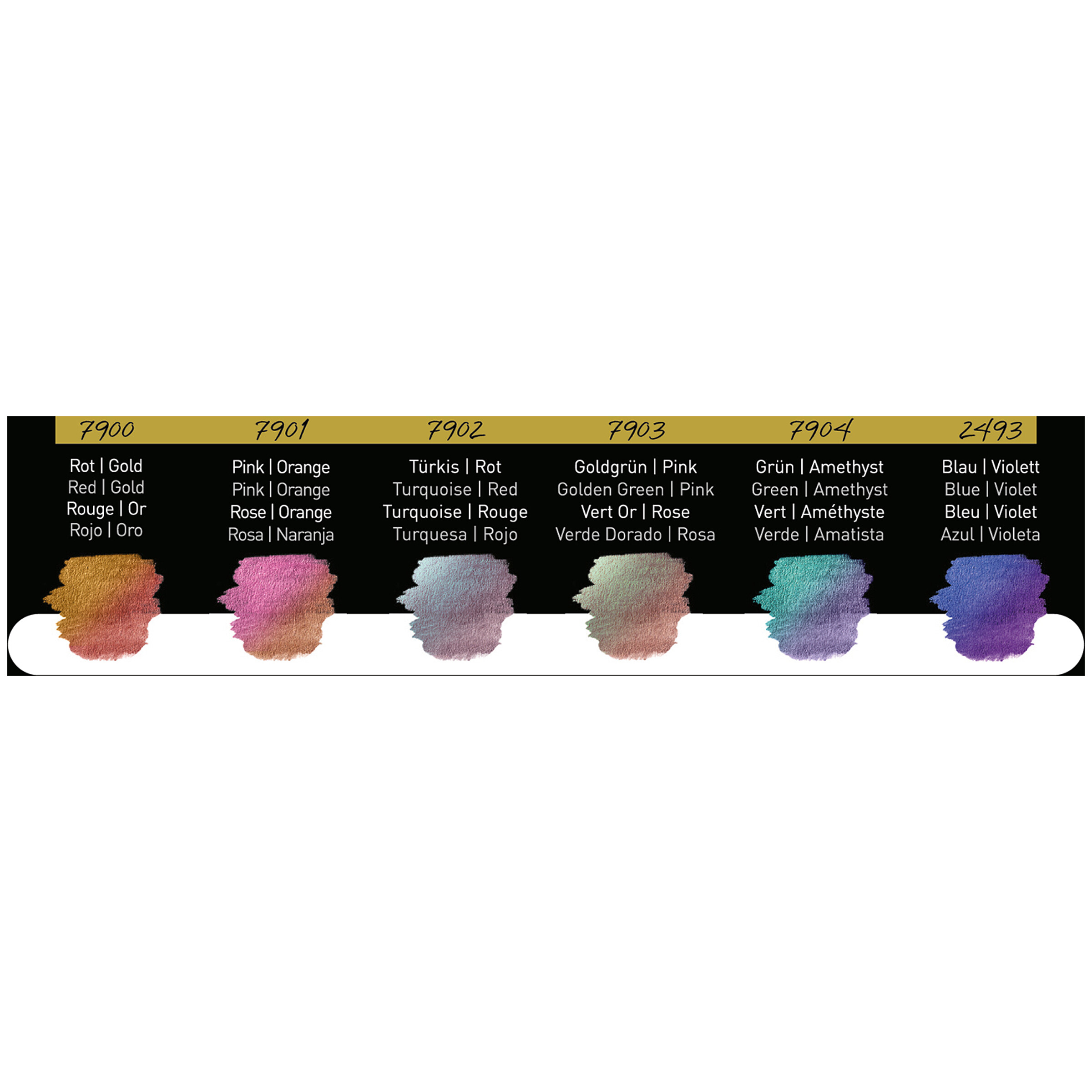 Das Set enthält sechs Premium-Farbtöne: die Flip-Flop-Farben Rot/Gold, Pink/Orange, Türkis/Rot, Goldgrün/Pink und Grün/Amethyst sowie den Two-Tone-Farbton Blauviolett.