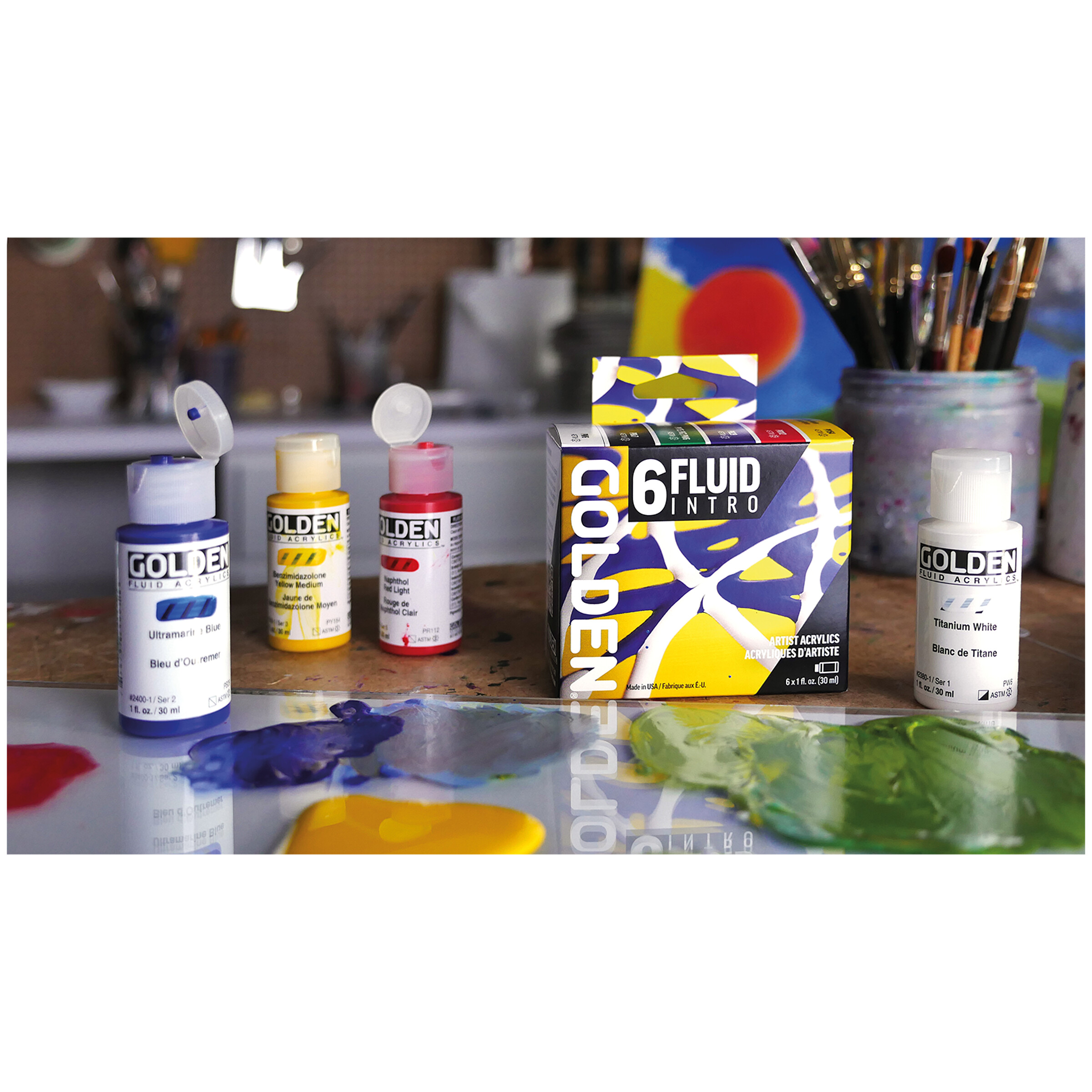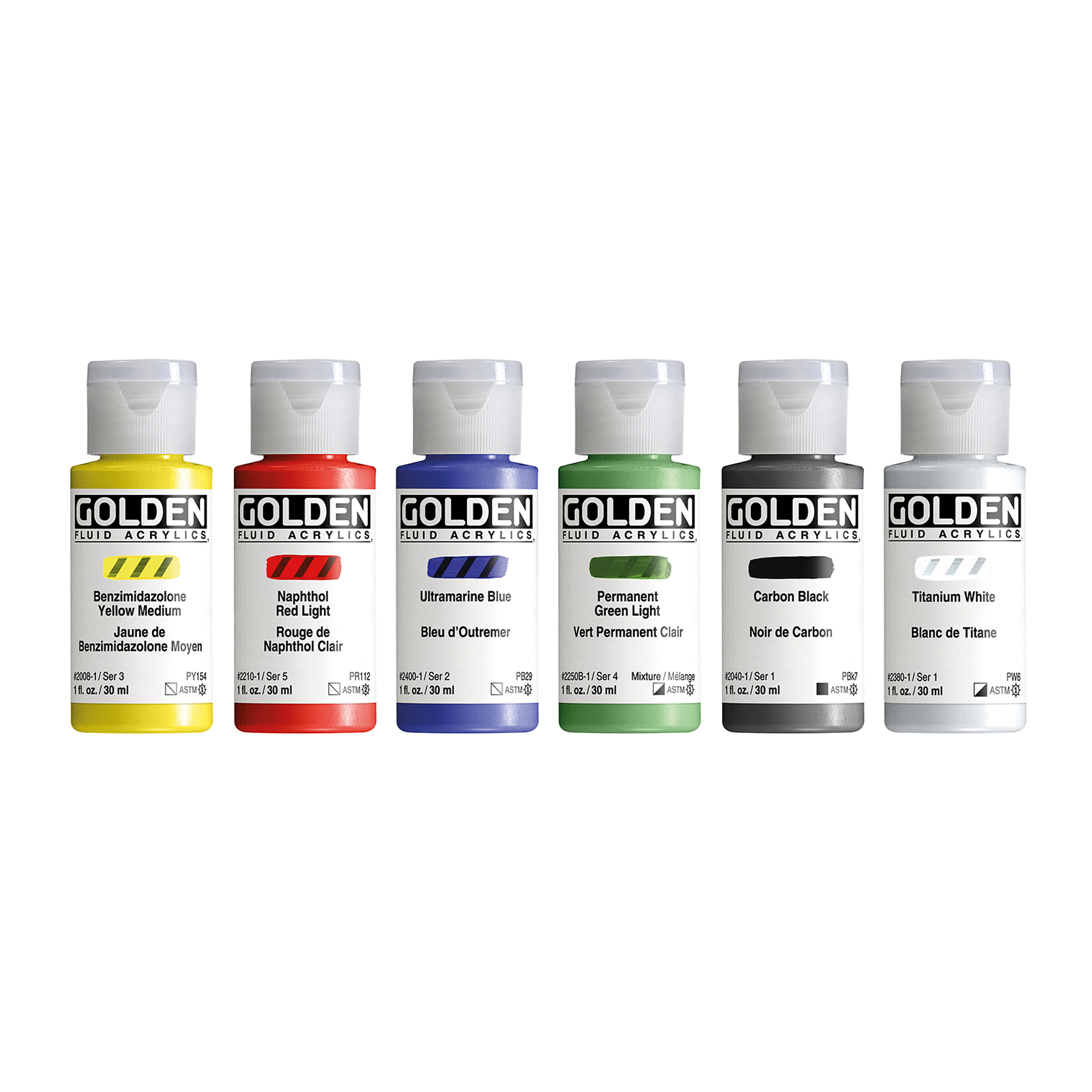 Golden Fluid Acrylics weisen eine sahneartige Konsistenz auf. Die hochpigmentierten Farben enthalten keine Zusatzstoffe wie z. B. Mattierungsmittel oder Füllstoffe, woraus eine hohe Brillanz resultiert. Fluid Acrylics sind lichtecht, alterungsbeständig und flexibel. Die Farben weisen eine gleichmässig fliessende Viskosität auf und eignen sich hervorragend für Detailarbeiten, Trockenpinseltechniken und Lasuren. Sie können mit dem Pinsel vermalt, gegossen oder gesprüht werden. Beim Hinzufügen von zusätzlichem Wasser bleibt die Qualität der Farbe erhalten.