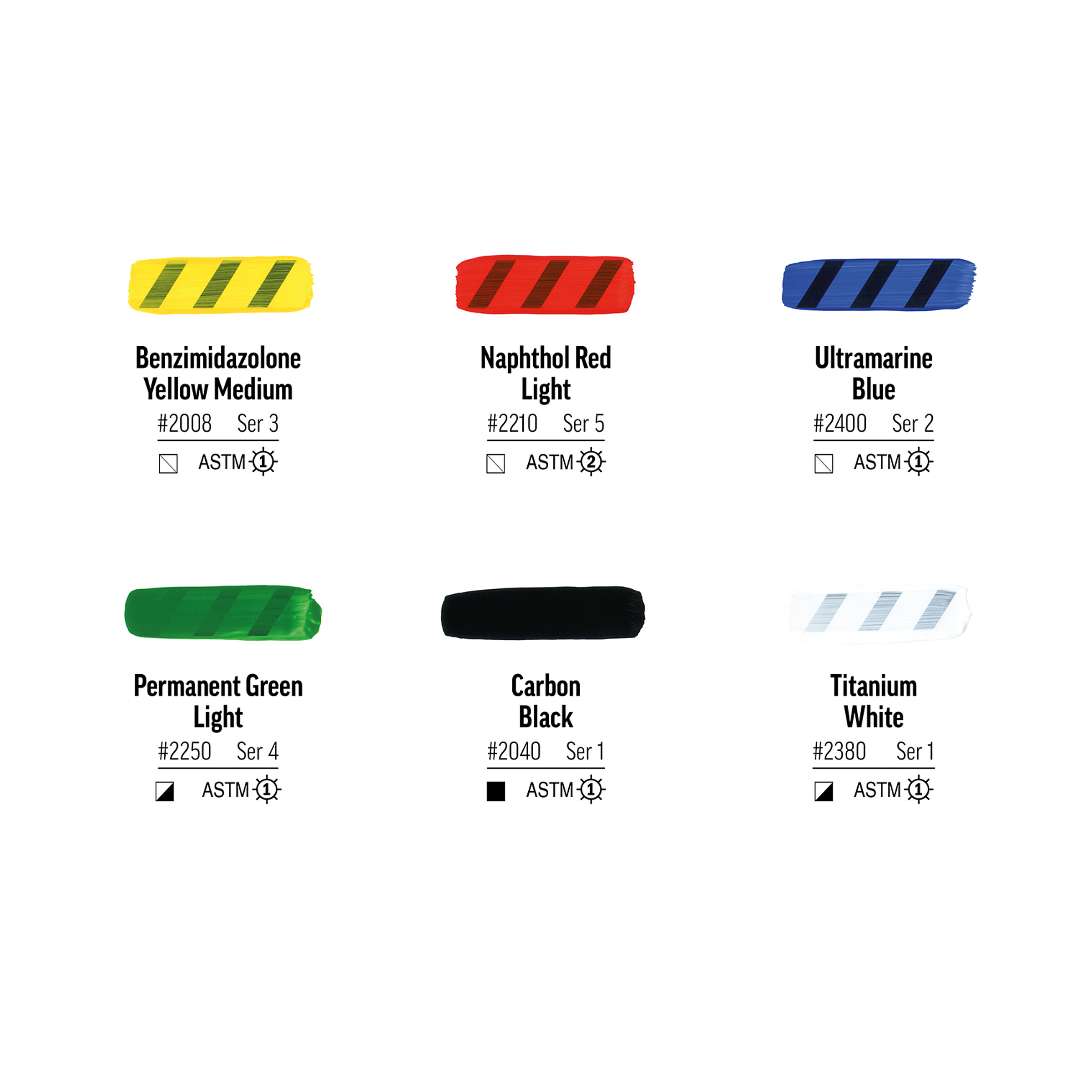 Das Set enthält die Farbtöne Benzimidazolone Yellow Medium, Naphthol Red Light, Ultramarine Blue, Permanent Green Light, Carbon Black und Titanium White.
